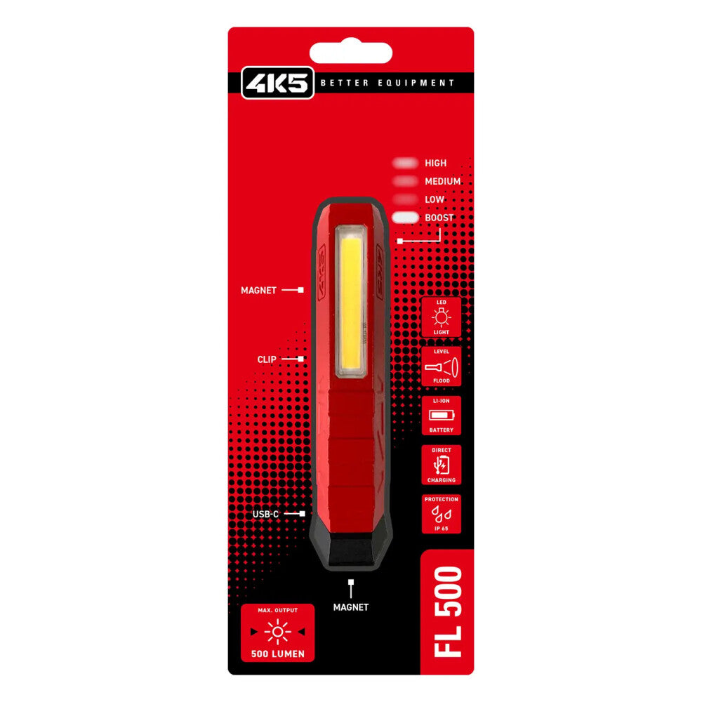 Set bevat: Compacte werklamp met 500 lumen lichtopbrengst, vier verlichtingsstanden, magnetische bevestiging en zakclip; ideaal voor bouwplaatsen, werkplaatsen en buitengebruik; inclusief USB-C opla...