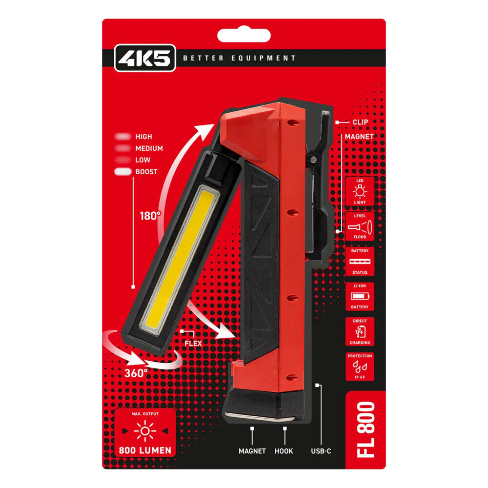 Set bevat: 4K5 FL800 Werklamp met 800 lumen, USB-C oplaadkabel en verwijderbare lithium-ion batterij. Ideaal voor bouwplaatsen, werkplaatsen en buitengebruik.