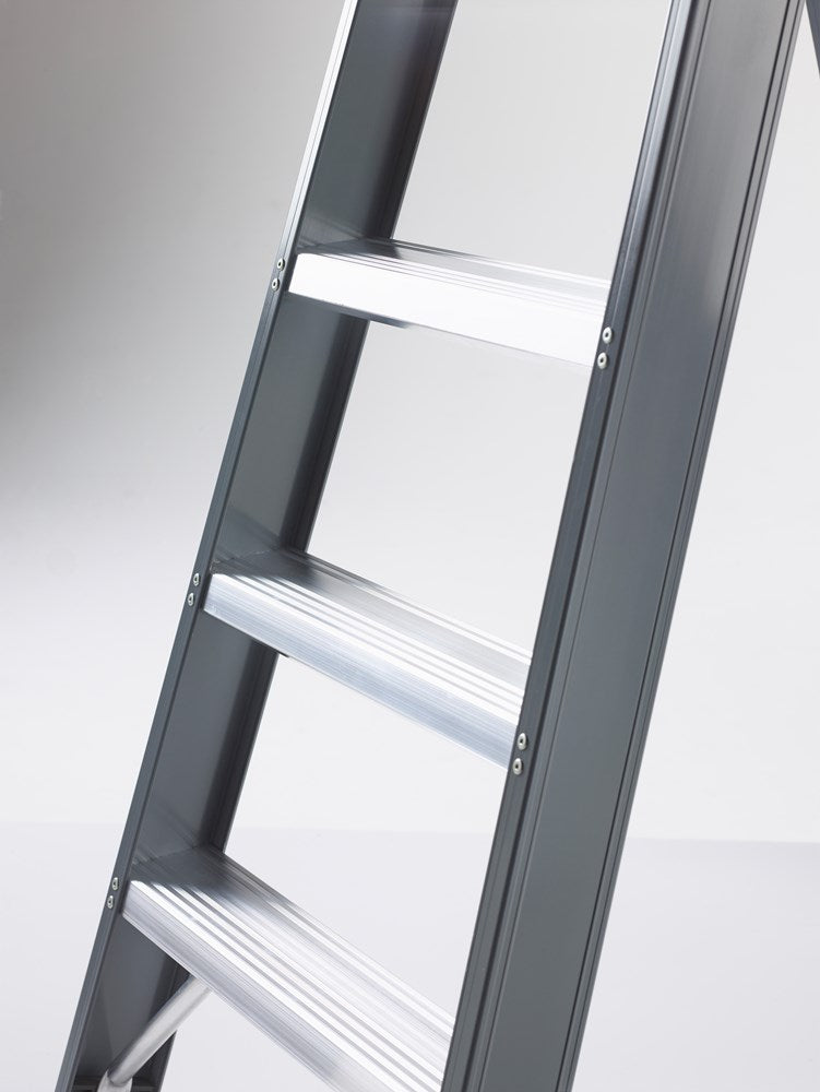 Het enkele kokerprofiel van de treden geeft de Falco meer stevigheid. De hoge afronding geven je scheenbenen optimale steun.