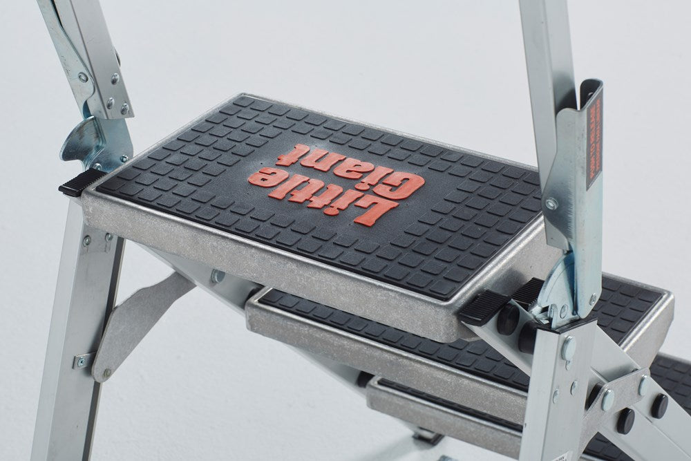 De Safety Step heeft twee wielen, wat handig is als je de trap vaak moet verplaatsen. Met de steunbeugel heb je extra grip. Bovendien geeft het bakje in de beugel je een plek voor je gereedschap (m.u.v. de 2-treeds).