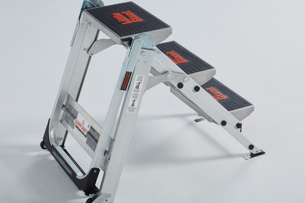 De Safety Step heeft twee wielen, wat handig is als je de trap vaak moet verplaatsen. Met de steunbeugel heb je extra grip. Bovendien geeft het bakje in de beugel je een plek voor je gereedschap (m.u.v. de 2-treeds).