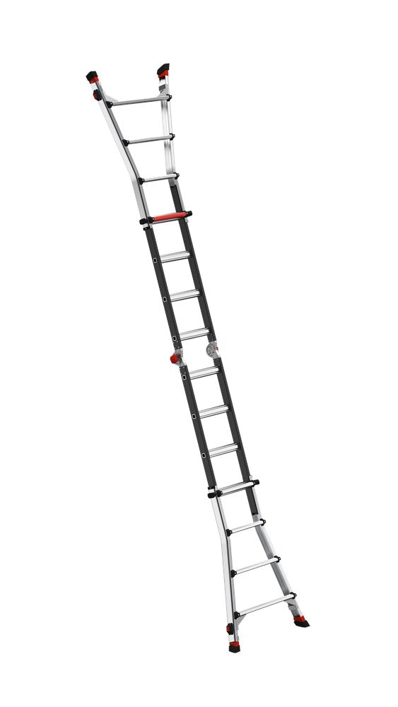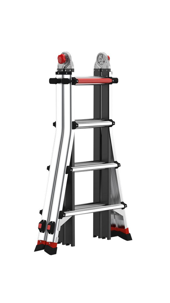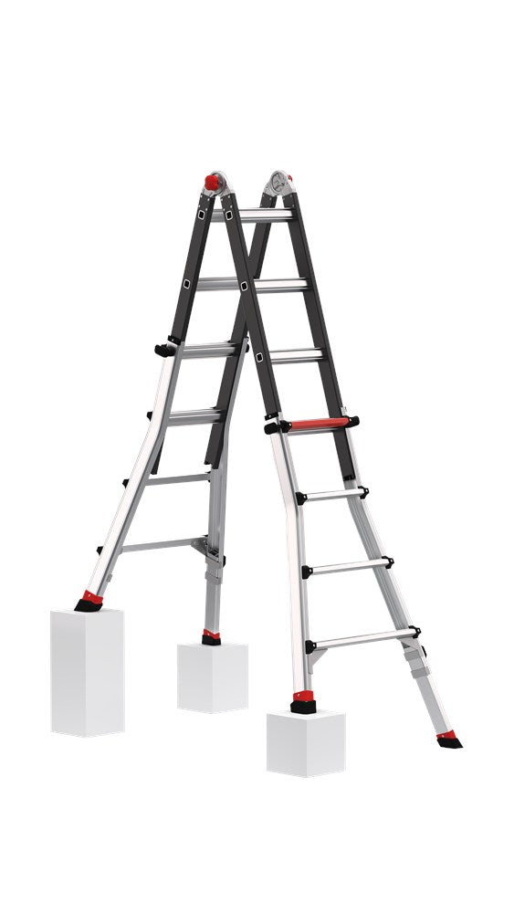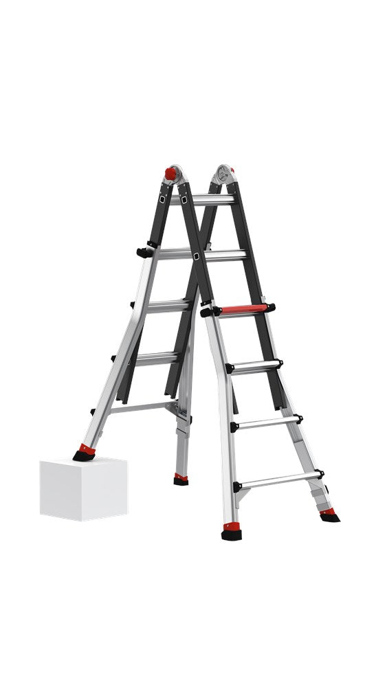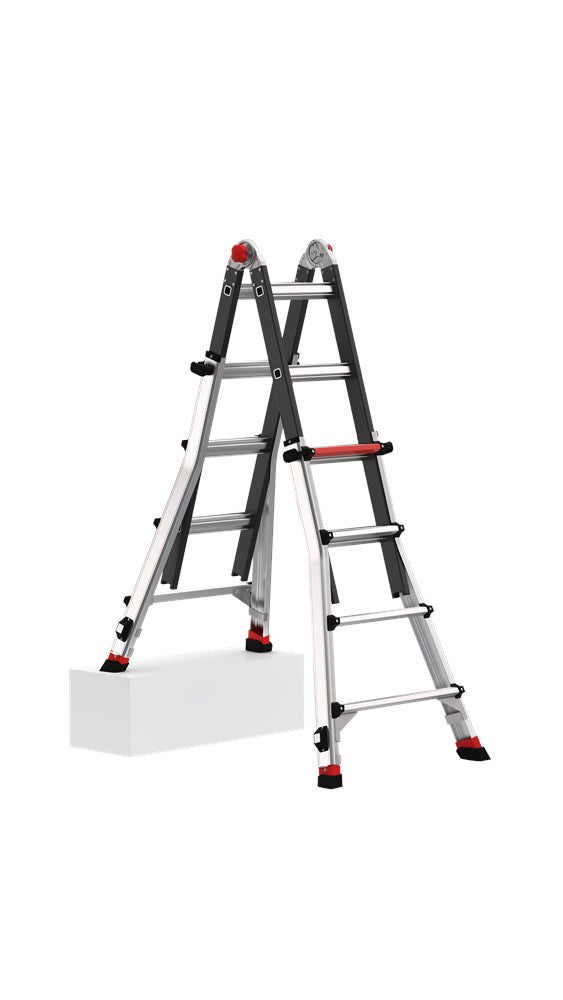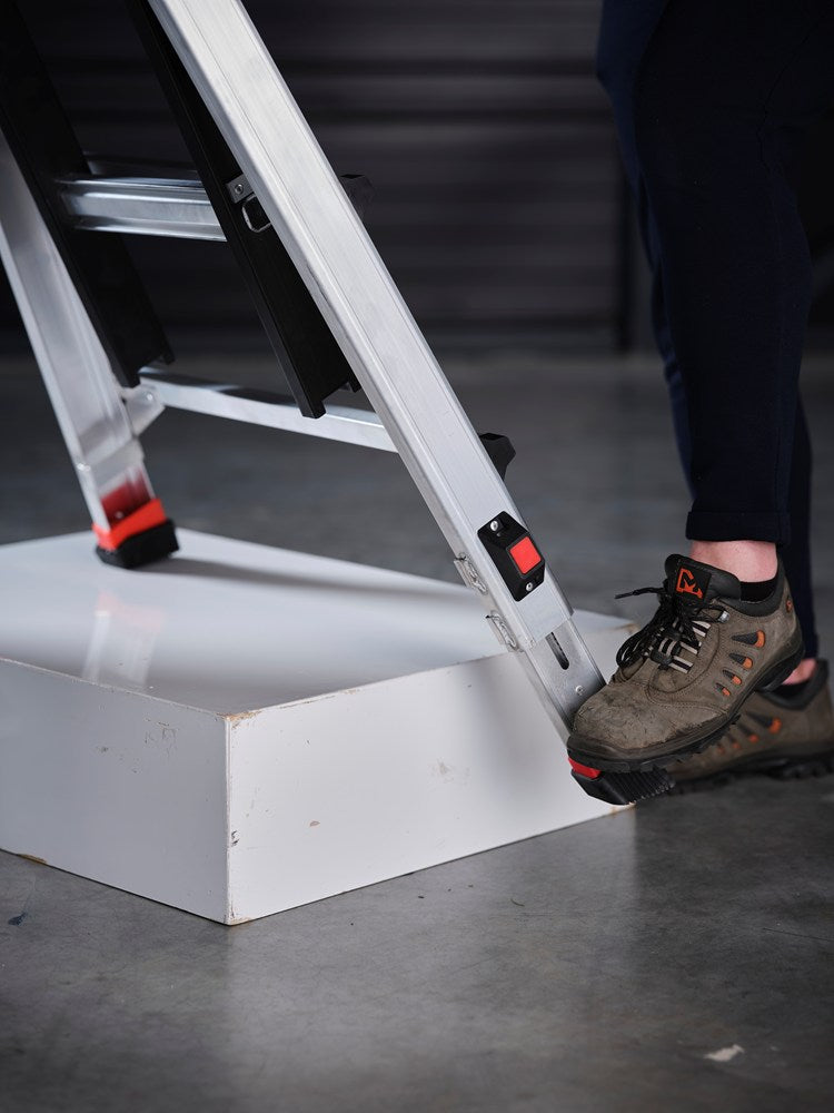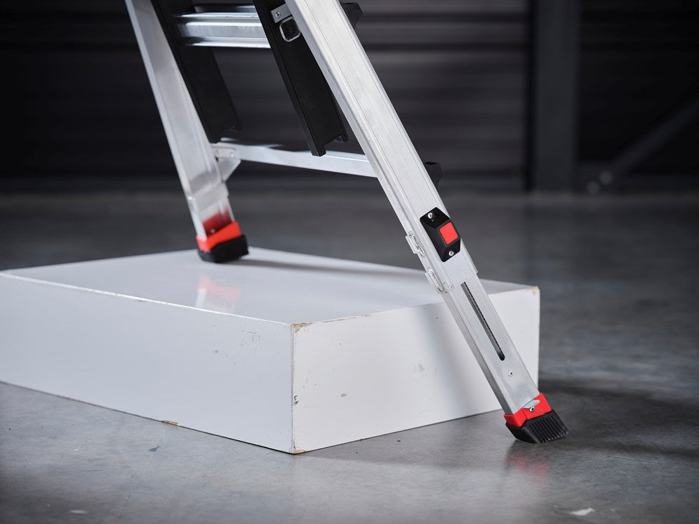 Dankzij het unieke telescopische systeem met twee individueel verstelbare laddervoeten aan één kant, kun je de ladder optimaal aanpassen aan ondergronden van verschillende hoogtes. Eenvoudig uit te schuiven met je voet. Met een maximale uitschuiflengte van 190 millimeter en automatisch vergrendelende stappen van 6 millimeter, is de ladder uitermate flexibel en zelfs veilig te gebruiken op de meeste gedraaide vaste trappen.