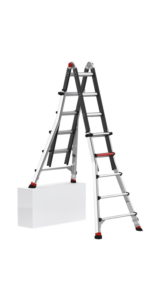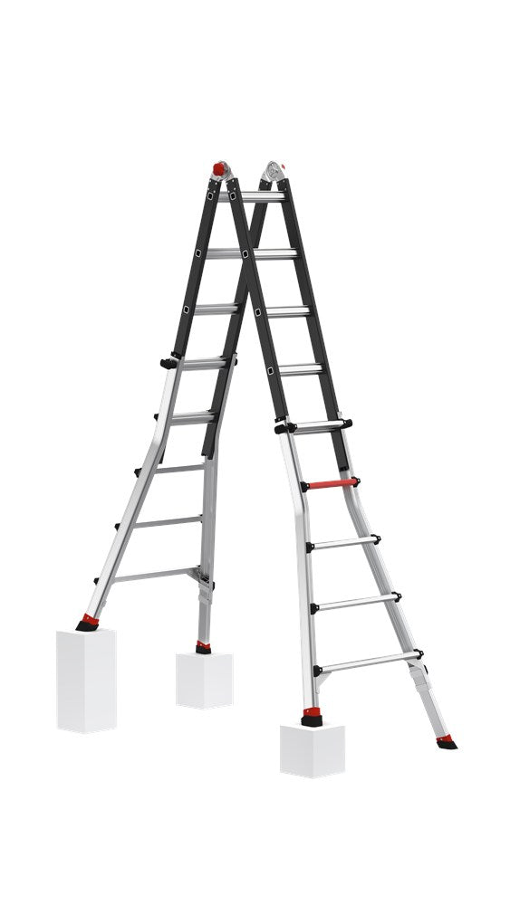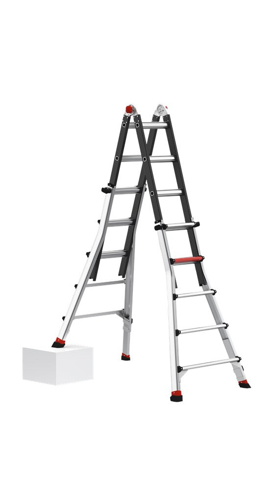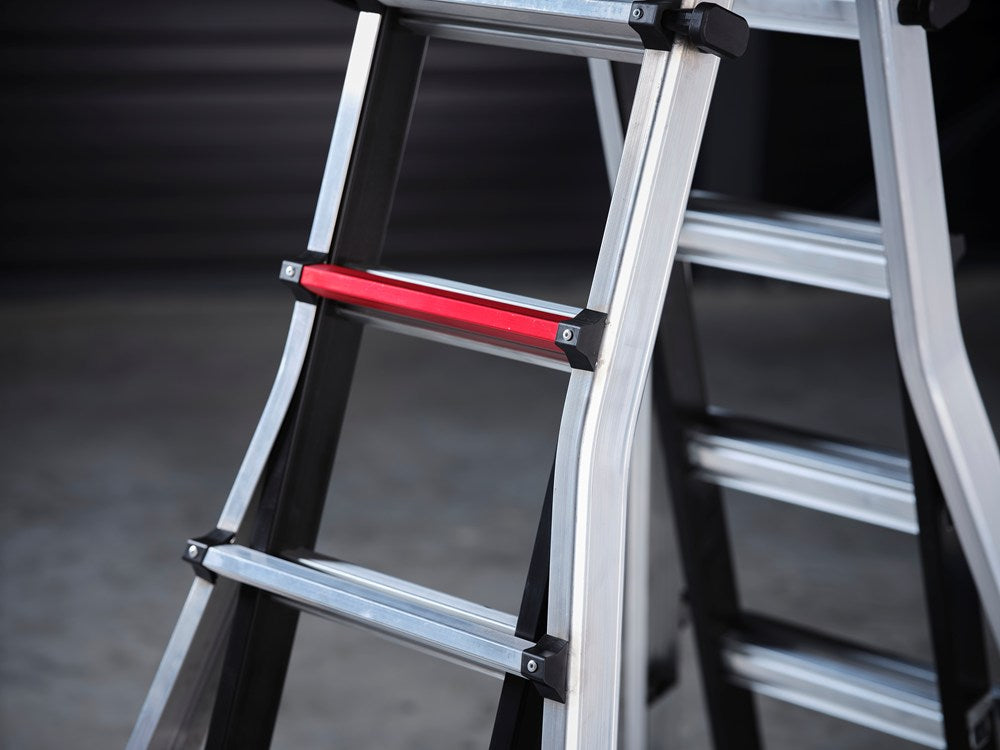 Flexibel telescopisch instelbaarDankzij het unieke telescopische systeem met twee individueel verstelbare laddervoeten aan één kant, kun je de ladder optimaal aanpassen aan ondergronden van verschillende hoogtes. Eenvoudig uit te schuiven met je voet. Met een maximale uitschuiflengte van 190 millimeter en automatisch vergrendelende stappen van 6 millimeter, is de ladder uitermate flexibel en zelfs veilig te gebruiken op de meeste gedraaide vaste trappen.