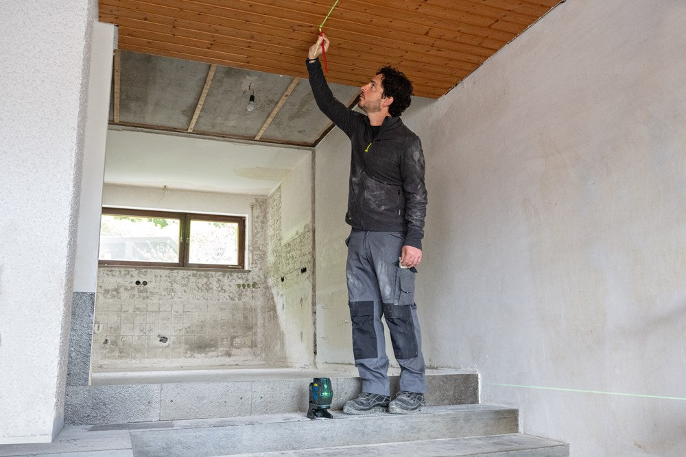 Combilaser met groene laserlijnen en -punten voor veelzijdig gebruik, inclusief rotatiehouder, laserdoelplaat, adapter voor alkalinebatterijen en bouwstatief voor flexibel gebruik en nauwkeurige positionering.