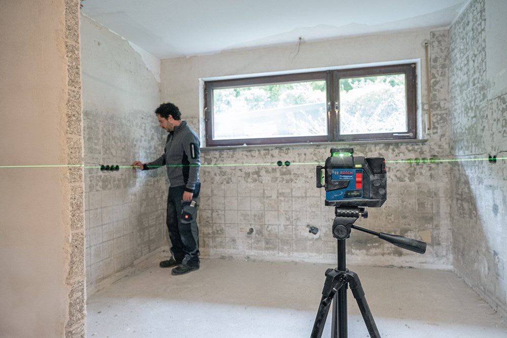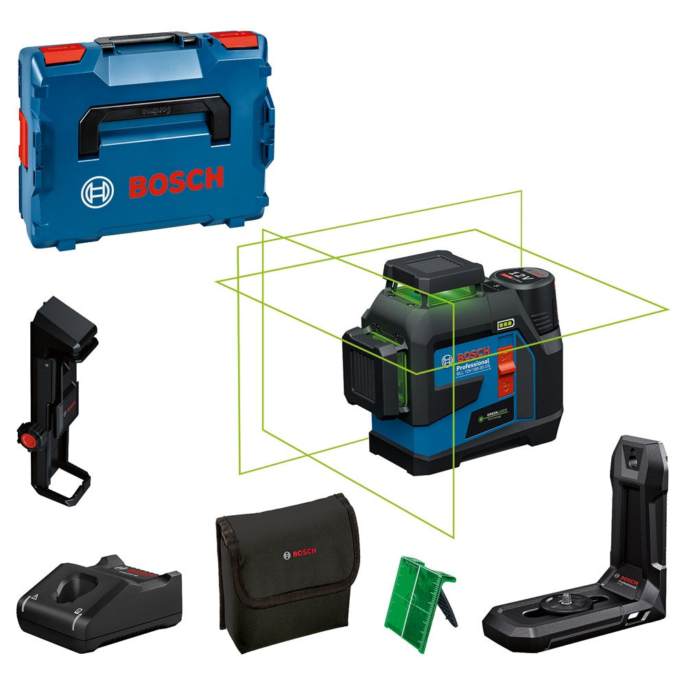 Lijnlaser met drie groene 360°-lijnen voor veelzijdig gebruik, inclusief accessoires zoals een plafondklem, universele houder, 12V 4.0Ah Li-ion accu en L-BOXX voor eenvoudig transport en veilige opslag.