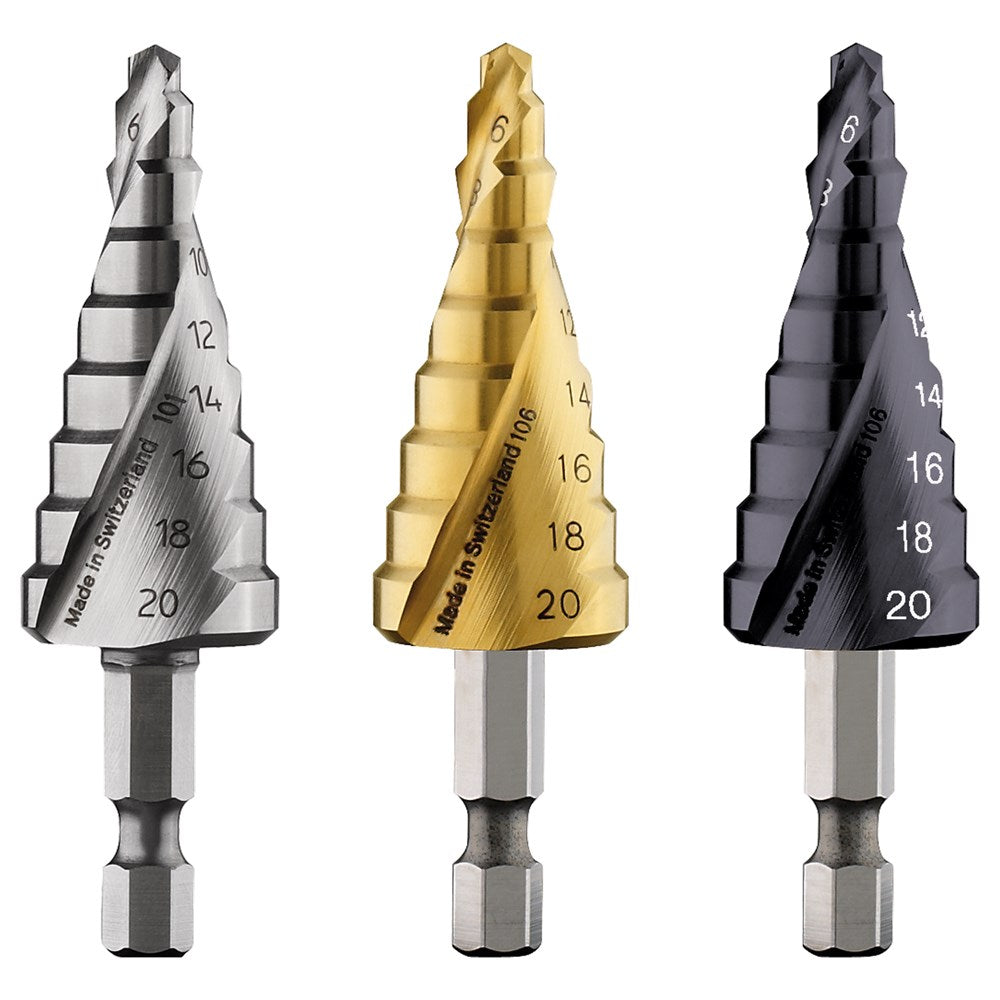 - HSS trappenboor kan met één boor gladde boringen van diverse diameters maken