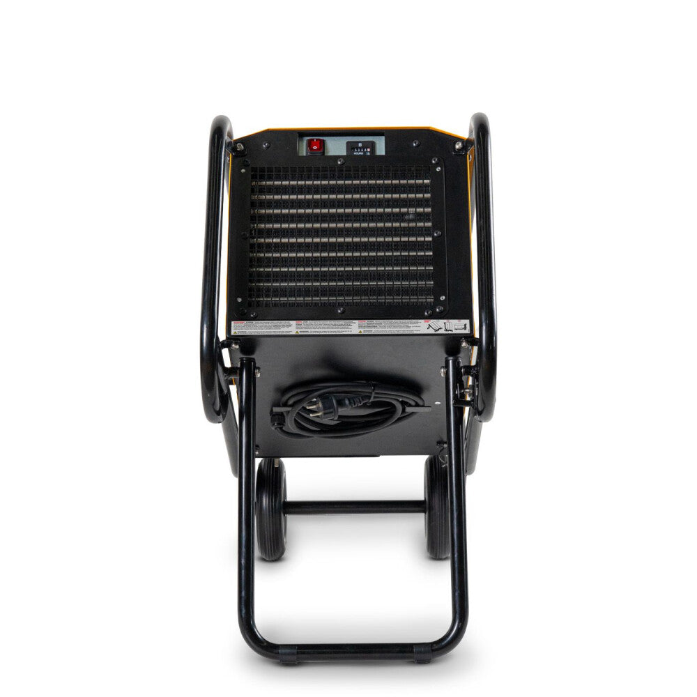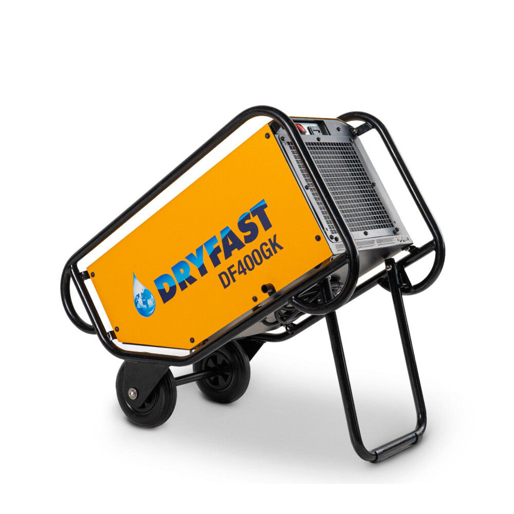 Set bevat: robuuste bouwdroger met verhuurframe en RVS-lekbak, geschikt voor intensief gebruik bij bouw, renovatie en waterschade.