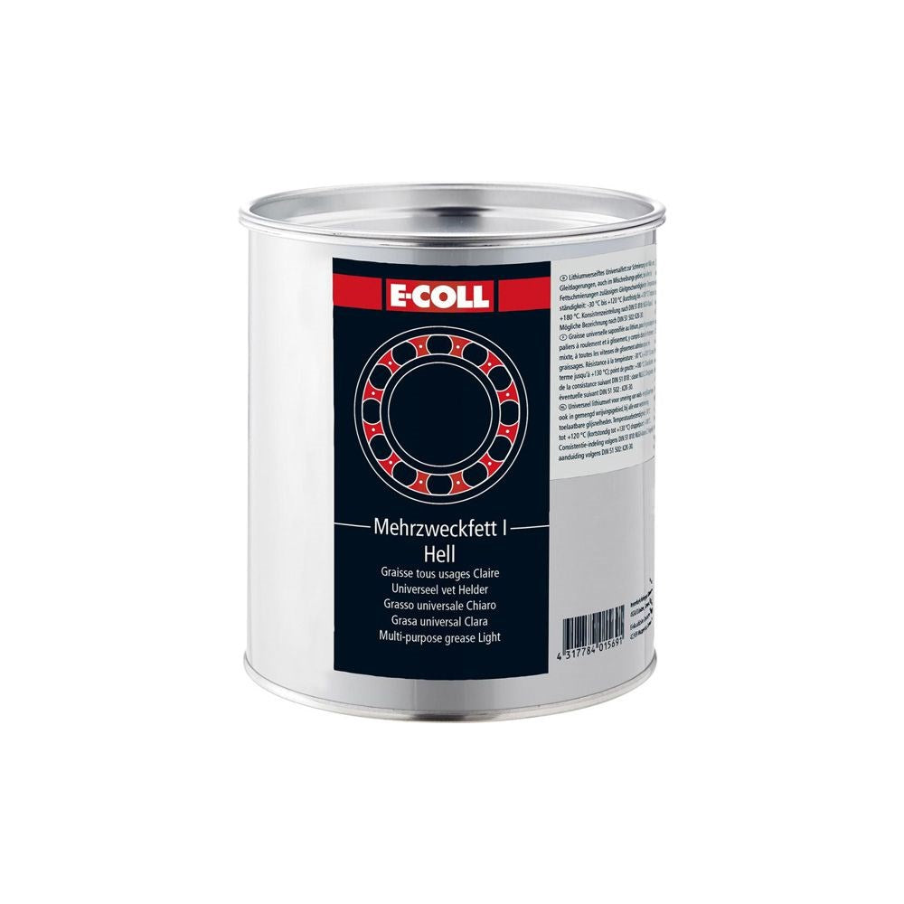 Set bevat: 1 blik E-COLL universeel vet licht 1kg, geschikt voor diverse toepassingen zoals autolagers, bouw- en landbouwmachines, en elektromotorlagers.