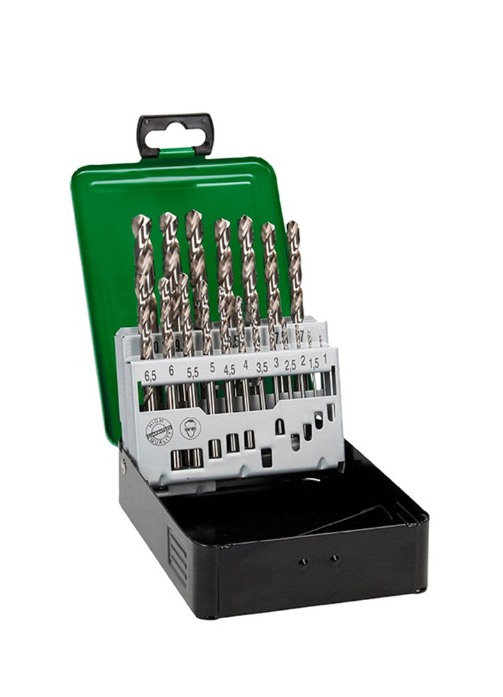 19-delige HSS-G boorcasette volgens DIN 338-normen, geschikt voor metaal, kunststof en hout. Maten van 1 mm tot 10 mm in stappen van 0,5 mm.
