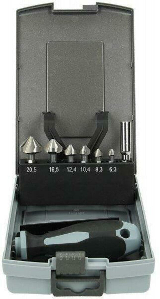 5-delige verzinkerset met 90° HSS-verzinkboren. Geschikt voor metaal, hout en kunststof. Diameters: 6 mm, 8 mm, 10 mm, 12 mm en 16 mm.