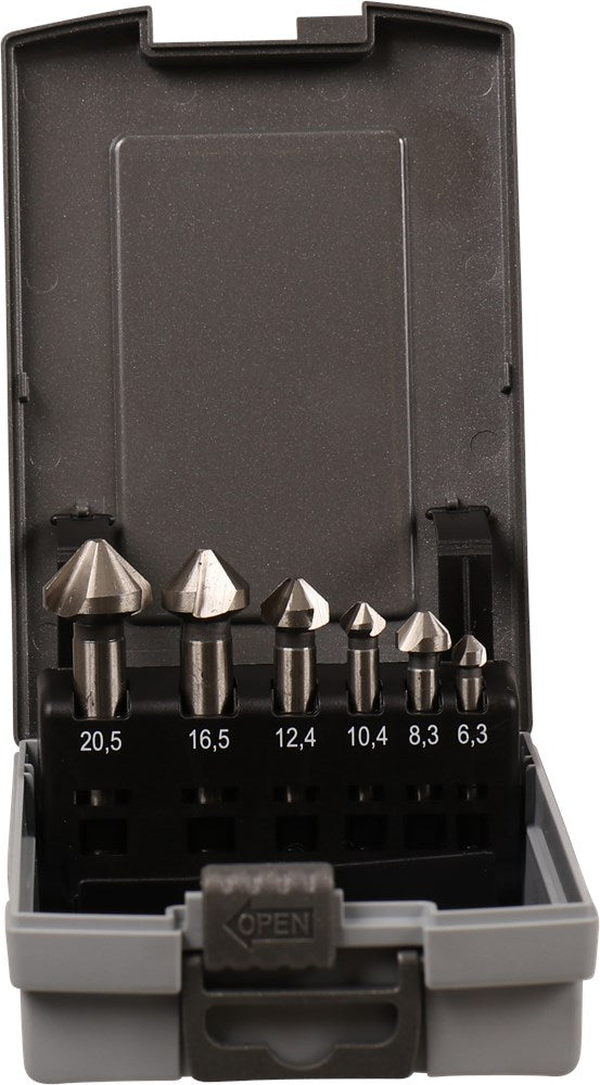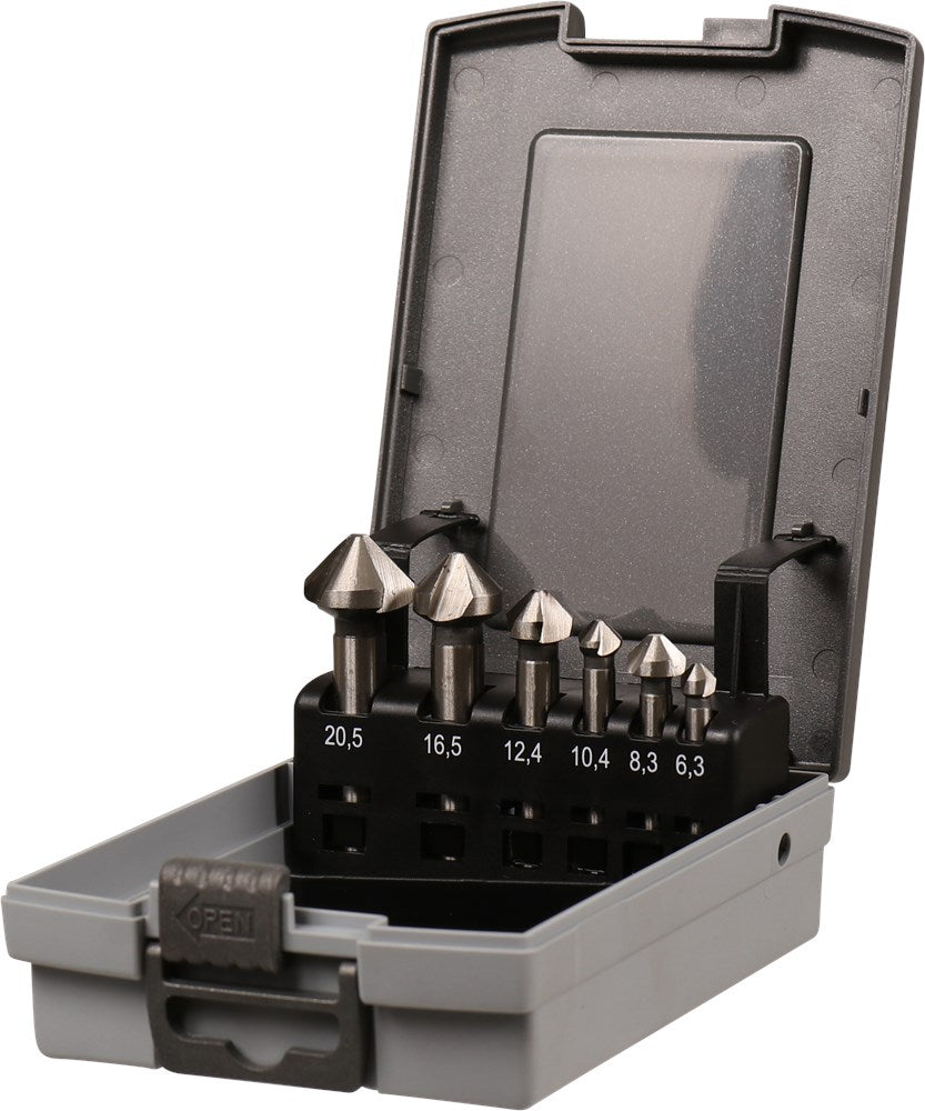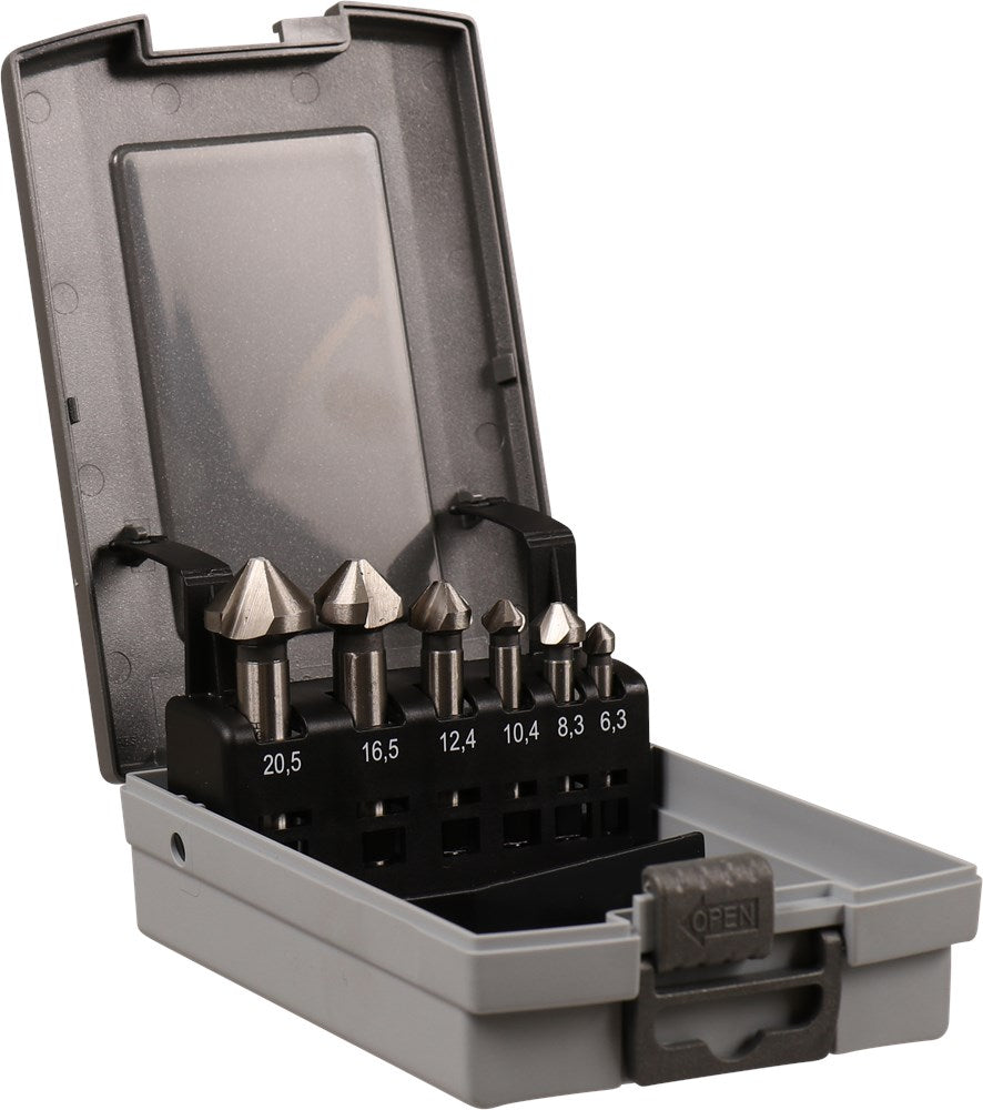 Hoogwaardige HSS verzinkborenset met 6 boren (Ø6,3-20,5mm) in metalen cassette, geschikt voor ontbramen en braamvrij verzinken in diverse materialen.