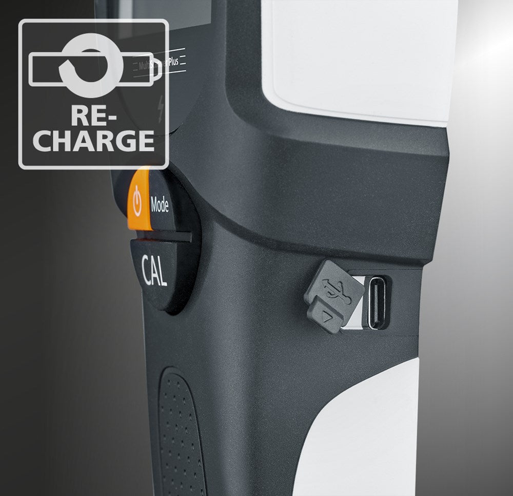 Set bevat: MultiScanner Plus met Li-ion accupak voor nauwkeurige detectie van metalen, stroomleidingen en balken; inclusief USB-C-kabel en draagkoffer voor eenvoudig transport en opladen.