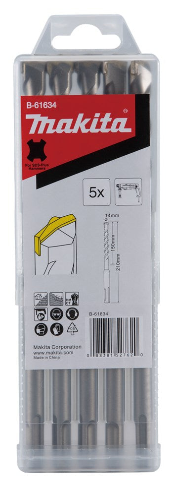 Makita kent een uitgebreide range aan betonboren. Voor elke klus en portemonnee is een betonboor beschikbaar: SP4S: Stofvrij Premium 4-snijder: Hoogste kwaliteit 4-snijder voor stofvrij werken. TNO-certificering met 8-uurs label in combinatie met een B-label stofzuiger. Voor droog metselwerk, beton, gewapend beton en (natuur)steen. P4S: Premium 4-snijder: Hoogste kwaliteit 4-snijder met lange levensduur. Door zijn dynamische boorpunt met unieke snijgeometrie en geoptimaliseerde spiraalvorm mag deze boor zich onder de beste in zijn soort scharen. Geschikt voor (gewapend) beton en (natuur)steen. B4S: Basis 4-snijder is een uitstekende boor die uitblinkt in zijn prijs-kwaliteitsverhouding. P2S: Premium 2-snijder: Hoge kwaliteit 2-snijder met lange levensduur. De dynamisch gevormde boorpunt garandeert een hoge boorsnelheid, de variabele boorspiraal zorgt voor een optimale afvoer van het boorgruis. B2S: Basis 2-snijder is een uitstekende boor die uitblinkt in zijn prijs-kwaliteitsverhouding. Makita betonboor met SDS-PLUS aansluiting en afmeting 14x210mm. Verpakking van 5 stuks.