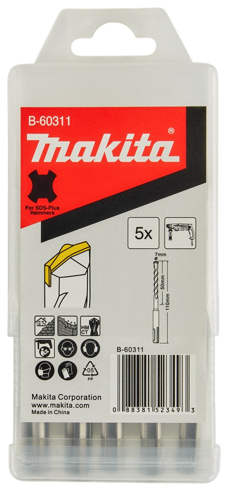Makita kent een uitgebreide range aan betonboren. Voor elke klus en portemonnee is een betonboor beschikbaar: SP4S: Stofvrij Premium 4-snijder: Hoogste kwaliteit 4-snijder voor stofvrij werken. TNO-certificering met 8-uurs label in combinatie met een B-label stofzuiger. Voor droog metselwerk, beton, gewapend beton en (natuur)steen. P4S: Premium 4-snijder: Hoogste kwaliteit 4-snijder met lange levensduur. Door zijn dynamische boorpunt met unieke snijgeometrie en geoptimaliseerde spiraalvorm mag deze boor zich onder de beste in zijn soort scharen. Geschikt voor (gewapend) beton en (natuur)steen. B4S: Basis 4-snijder is een uitstekende boor die uitblinkt in zijn prijs-kwaliteitsverhouding. P2S: Premium 2-snijder: Hoge kwaliteit 2-snijder met lange levensduur. De dynamisch gevormde boorpunt garandeert een hoge boorsnelheid, de variabele boorspiraal zorgt voor een optimale afvoer van het boorgruis. B2S: Basis 2-snijder is een uitstekende boor die uitblinkt in zijn prijs-kwaliteitsverhouding. Makita betonboor met SDS-PLUS aansluiting en afmeting 7x110mm. Verpakking van 5 stuks.