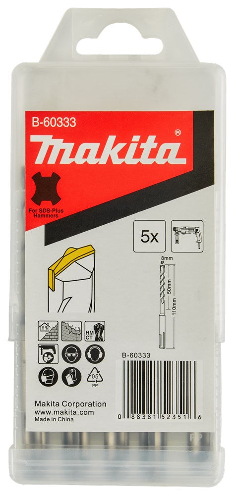 Makita kent een uitgebreide range aan betonboren. Voor elke klus en portemonnee is een betonboor beschikbaar: SP4S: Stofvrij Premium 4-snijder: Hoogste kwaliteit 4-snijder voor stofvrij werken. TNO-certificering met 8-uurs label in combinatie met een B-label stofzuiger. Voor droog metselwerk, beton, gewapend beton en (natuur)steen. P4S: Premium 4-snijder: Hoogste kwaliteit 4-snijder met lange levensduur. Door zijn dynamische boorpunt met unieke snijgeometrie en geoptimaliseerde spiraalvorm mag deze boor zich onder de beste in zijn soort scharen. Geschikt voor (gewapend) beton en (natuur)steen. B4S: Basis 4-snijder is een uitstekende boor die uitblinkt in zijn prijs-kwaliteitsverhouding. P2S: Premium 2-snijder: Hoge kwaliteit 2-snijder met lange levensduur. De dynamisch gevormde boorpunt garandeert een hoge boorsnelheid, de variabele boorspiraal zorgt voor een optimale afvoer van het boorgruis. B2S: Basis 2-snijder is een uitstekende boor die uitblinkt in zijn prijs-kwaliteitsverhouding. Makita betonboor met SDS-PLUS aansluiting en afmeting 8x110mm. Verpakking van 5 stuks.