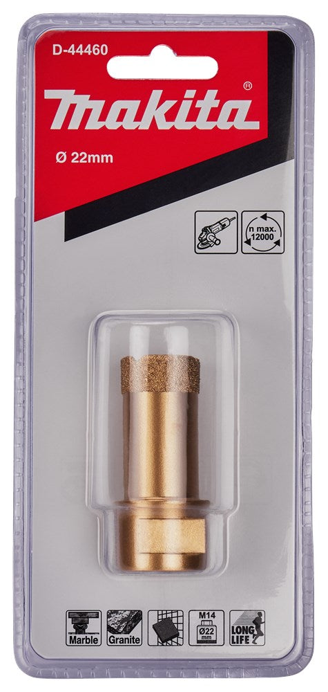 Makita diamantboor voor droog gebruik. Geschikt voor het boren van porseleinen tegels. Makita diamantboor met M14 aansluiting, diameter 22mm. Geschikt voor boren in bijvoorbeeld graniet en marmer.