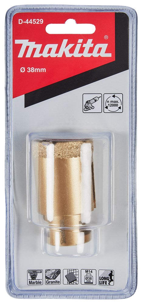 Makita diamantboor voor droog gebruik. Geschikt voor het boren van porseleinen tegels. Makita diamantboor met M14 aansluiting, diameter 38mm. Geschikt voor boren in bijvoorbeeld graniet en marmer.
