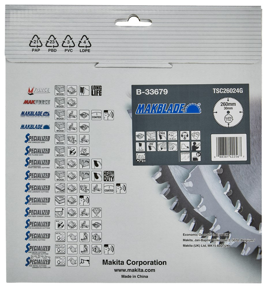 Makita HM Zaagblad 260X2,3X30 20G T24 Hout 260X30X2,3 24T – B-33679