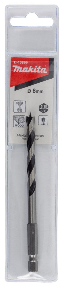 Makita houtboren met boorpunt, zijsnijders en geslepen spiraal. Boorkleur: zwart. Uitermate geschikt voor het boren in zacht- en hardhout, spaanplaat, gefineerde meubelpanelen, triplex en multiplex. Houtspiraalboor 6x110mm met boorpunt. Boor met 1/4" zeskant vorm E aansluiting, hierdoor uitstekend geschikt voor toepassingen met slagschroevendraaiers die enkel voorzien zijn van 1/4" opname.