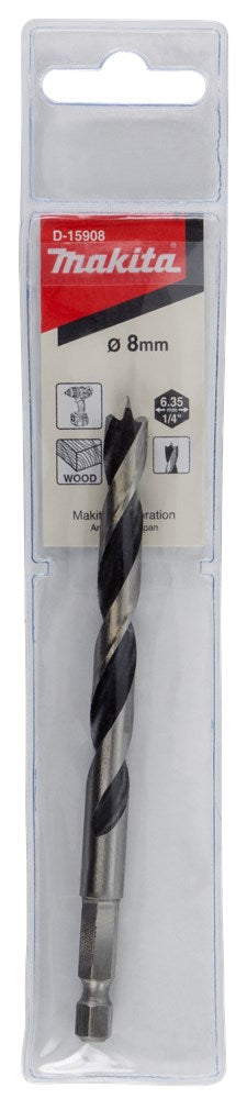 Makita houtboren met boorpunt, zijsnijders en geslepen spiraal. Boorkleur: zwart. Uitermate geschikt voor het boren in zacht- en hardhout, spaanplaat, gefineerde meubelpanelen, triplex en multiplex. Houtspiraalboor 8x115mm met boorpunt. Boor met 1/4" zeskant vorm E aansluiting, hierdoor uitstekend geschikt voor toepassingen met slagschroevendraaiers die enkel voorzien zijn van 1/4" opname.