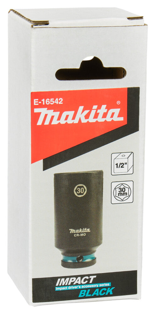 Makita Krachtdop Impact Black 1/2" VK, 1 stuk. Set bevat: 1 krachtdop met 30mm dopmaat en 1/2" vierkante aansluiting.