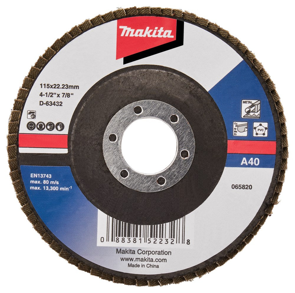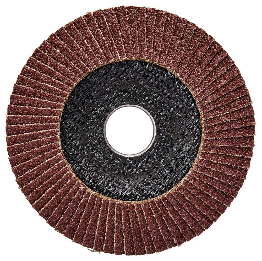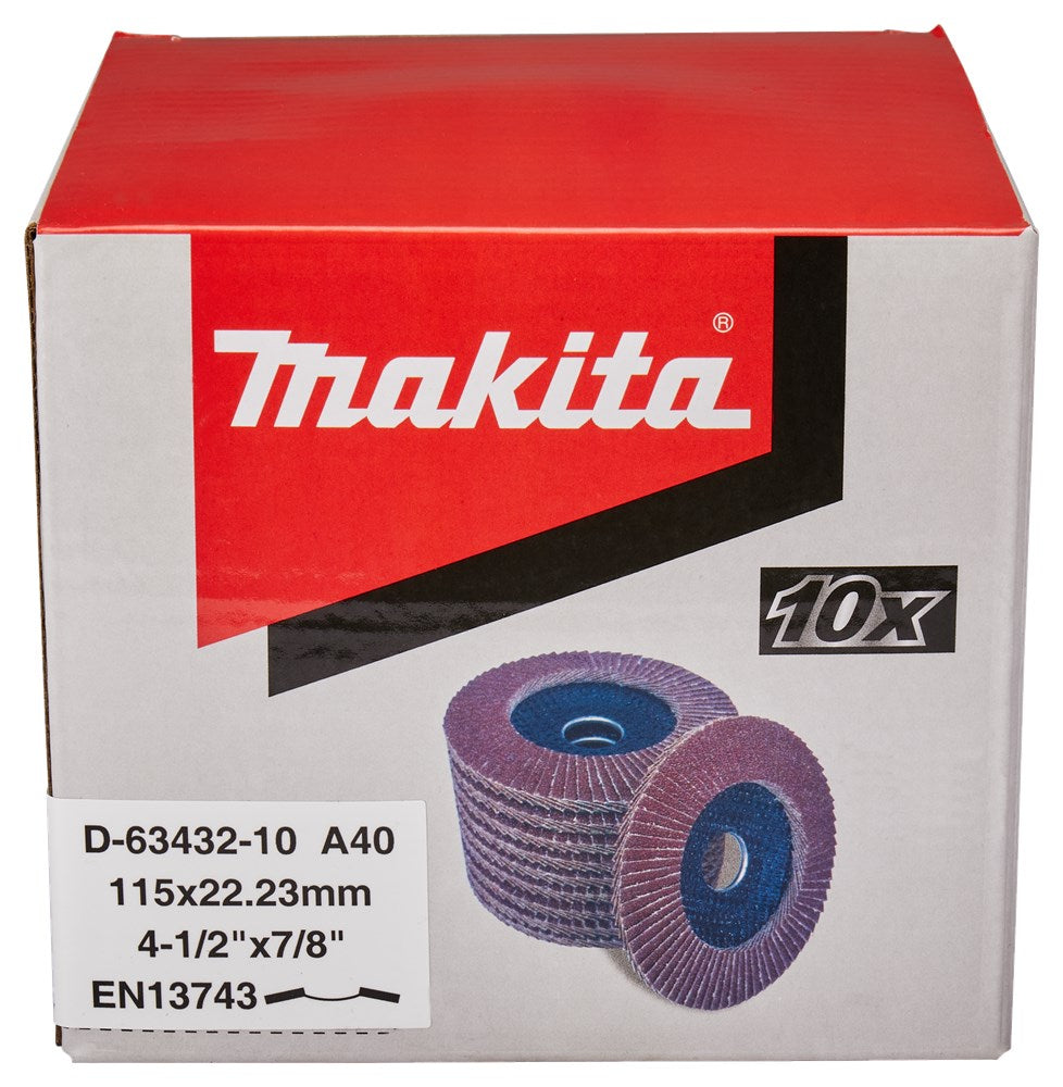 Lamellenschuurschijven zijn voorzien van lamellen bestaande uit een rug van vezelstof en korrels. Deze zijn geplaatst op een schijf met een rug van glasvezels. Doordat de schijf opgebouwd is uit lamellen is deze veerkrachtiger dan een schuurschijf en minder agressief voor het te bewerken materiaal. Bijzonder geschikt voor het schuren van lasnaden. Soorten korrel: Aluminiumoxide [A]: Zeer geschikt voor staal. Geschikt voor aluminium, non-ferro metalen en kunststoffen. Zirkoniumoxide [Z]: Zeer geschikt voor RVS. Geschikt voor staal, aluminium en non-ferro metalen. Keramisch aluminiumoxide [Ce]: Zeer geschikt voor RVS. Geschikt voor staal, aluminium en non-ferro metalen. Siliciumcarbide [S]: Zeer geschikt voor mortel en steen. Vom van de schijf: Vlakke schijven gebruik je voor het vlakschuren van oppervlakken. Plaatst deze onder een hoek van 0-15° op het materiaal voor een optimaal gebruik. Schuine schijven gebruik je voor het schuren van lasnaden, slijpen van vellingkanten en ontbramen. Plaats deze onder een hoek van 10-25° op het materiaal voor een optimaal gebruik. Korrels: 36/40: Lasnaadbewerking en vellingkanten. 60: Lasnaadbewerking, vellingkanten, ontbramen en vlakschuren. 80: Ontbramen en vlakschuren. 120: Vlakschuren. Voordelige Makita aluminiumoxide lamellenschuurschijf schuin met glasvezel versterkte rug. Diameter 115mm met korrel 40. Zeer geschikt voor: metaal. Geschikt voor: kunststof, non-ferro metalen en hout. Verpakkingseenheid: 10 stuks. Tevens per stuk verkrijgbaar D-63432.