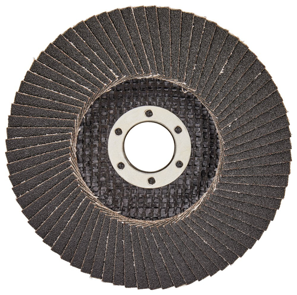 Lamellenschuurschijven zijn voorzien van lamellen bestaande uit een rug van vezelstof en korrels. Deze zijn geplaatst op een schijf met een rug van glasvezels. Doordat de schijf opgebouwd is uit lamellen is deze veerkrachtiger dan een schuurschijf en minder agressief voor het te bewerken materiaal. Bijzonder geschikt voor het schuren van lasnaden. Soorten korrel: Aluminiumoxide [A]: Zeer geschikt voor staal. Geschikt voor aluminium, non-ferro metalen en kunststoffen. Zirkoniumoxide [Z]: Zeer geschikt voor RVS. Geschikt voor staal, aluminium en non-ferro metalen. Keramisch aluminiumoxide [Ce]: Zeer geschikt voor RVS. Geschikt voor staal, aluminium en non-ferro metalen. Siliciumcarbide [S]: Zeer geschikt voor mortel en steen. Vom van de schijf: Vlakke schijven gebruik je voor het vlakschuren van oppervlakken. Plaatst deze onder een hoek van 0-15° op het materiaal voor een optimaal gebruik. Schuine schijven gebruik je voor het schuren van lasnaden, slijpen van vellingkanten en ontbramen. Plaats deze onder een hoek van 10-25° op het materiaal voor een optimaal gebruik. Korrels: 36/40: Lasnaadbewerking en vellingkanten. 60: Lasnaadbewerking, vellingkanten, ontbramen en vlakschuren. 80: Ontbramen en vlakschuren. 120: Vlakschuren. Makita silicium-carbide lamellenschuurschijf schuin met glasvezel versterkte rug. Diameter 125mm met korrel 80. Zeer geschikt voor: steen.