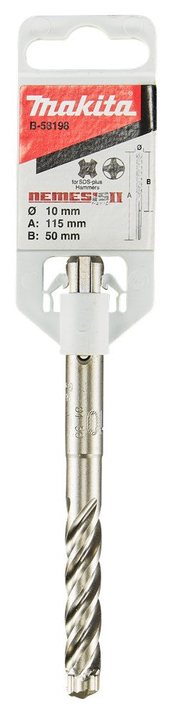 Makita kent een uitgebreide range aan betonboren. Voor elke klus en portemonnee is een betonboor beschikbaar: SP4S: Stofvrij Premium 4-snijder: Hoogste kwaliteit 4-snijder voor stofvrij werken. TNO-certificering met 8-uurs label in combinatie met een B-label stofzuiger. Voor droog metselwerk, beton, gewapend beton en (natuur)steen. P4S: Premium 4-snijder: Hoogste kwaliteit 4-snijder met lange levensduur. Door zijn dynamische boorpunt met unieke snijgeometrie en geoptimaliseerde spiraalvorm mag deze boor zich onder de beste in zijn soort scharen. Geschikt voor (gewapend) beton en (natuur)steen. B4S: Basis 4-snijder is een uitstekende boor die uitblinkt in zijn prijs-kwaliteitsverhouding. P2S: Premium 2-snijder: Hoge kwaliteit 2-snijder met lange levensduur. De dynamisch gevormde boorpunt garandeert een hoge boorsnelheid, de variabele boorspiraal zorgt voor een optimale afvoer van het boorgruis. B2S: Basis 2-snijder is een uitstekende boor die uitblinkt in zijn prijs-kwaliteitsverhouding. Betonboor 10x115mm met SDS-PLUS aansluiting. Viersnijder uit het NemesisII-assortiment, de hoogste kwaliteit Makita betonboren.
