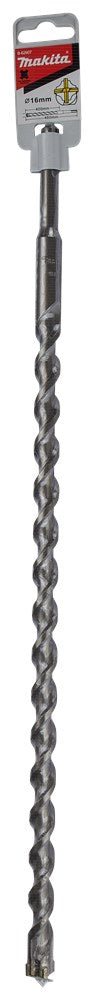 Makita kent een uitgebreide range aan betonboren. Voor elke klus en portemonnee is een betonboor beschikbaar: SP4S: Stofvrij Premium 4-snijder: Hoogste kwaliteit 4-snijder voor stofvrij werken. TNO-certificering met 8-uurs label in combinatie met een B-label stofzuiger. Voor droog metselwerk, beton, gewapend beton en (natuur)steen. P4S: Premium 4-snijder: Hoogste kwaliteit 4-snijder met lange levensduur. Door zijn dynamische boorpunt met unieke snijgeometrie en geoptimaliseerde spiraalvorm mag deze boor zich onder de beste in zijn soort scharen. Geschikt voor (gewapend) beton en (natuur)steen. B4S: Basis 4-snijder is een uitstekende boor die uitblinkt in zijn prijs-kwaliteitsverhouding. P2S: Premium 2-snijder: Hoge kwaliteit 2-snijder met lange levensduur. De dynamisch gevormde boorpunt garandeert een hoge boorsnelheid, de variabele boorspiraal zorgt voor een optimale afvoer van het boorgruis. B2S: Basis 2-snijder is een uitstekende boor die uitblinkt in zijn prijs-kwaliteitsverhouding. Makita SDS-PLUS 4-snijder betonboor, afmeting 16x460mm.