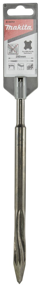 Puntbeitels, voor algemeen hak- en breekwerk in muren en beton. Zelfscherpende puntbeitel 250mm met SDS-PLUS aansluiting en Spin Action punt. Bij deze beitel is herslijpen niet nodig; hij blijft scherp en efficiënt, en heeft een lange levensduur.