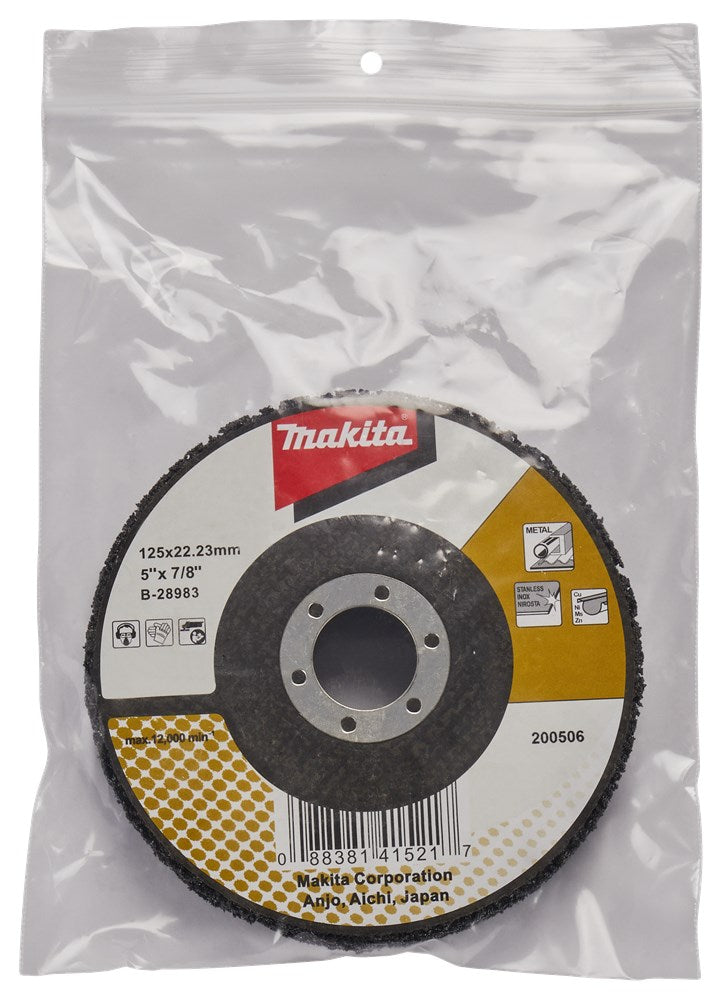 Zwarte Makita silicium-carbide reinigingsschijf met glasvezel versterkte rug. Diameter 125mm. Zeer geschikt voor het verwijderen van verfresten, epoxyresten, roestplekken en lasverkleuringen. De open structuur en het gebruikte zachte schijfmateriaal voorkomt beschadigingen aan de onderlaag van het werkstuk. Tevens verkrijgbaar in paars (langere levensduur, lagere bewerkingssnelheid) [B-29022] en met nylon versterkte rug in zwart [B-29066] en paars [B-36267].