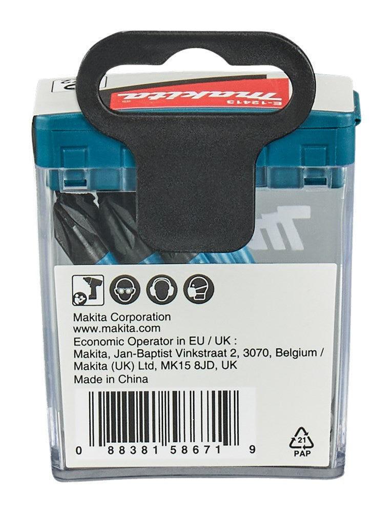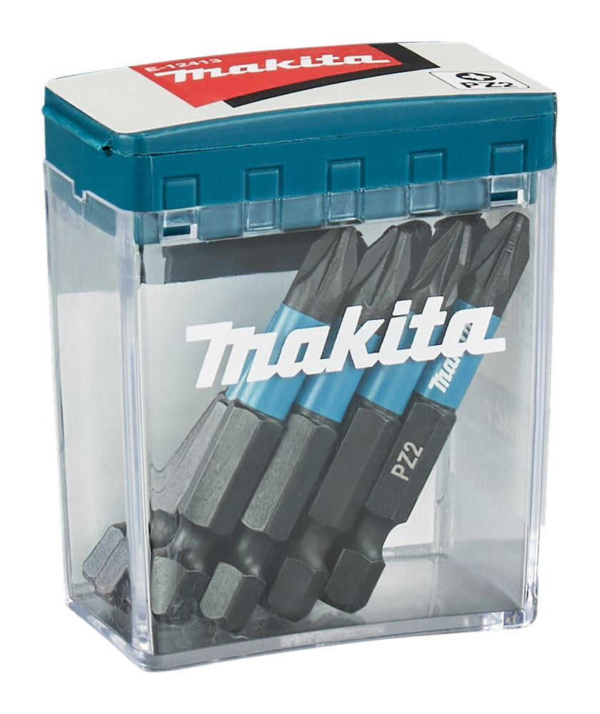 Makita schroefbits en slagschroefbits in verschillende lengtes en paskoppen. Voor elke klus is er een geschikte schroefbit beschikbaar. Kwalitatieve schroefbits in opbouw van Standaard, Impact Black, Impact Silver en Impact Gold naar Impact Premier. Kruiskop Pozidriv-bit PZ2 uit de Makita Impact Black-serie. Door hoog torsievermogen ook geschikt voor de slagschroevendraaier. Deze bits hebben een betere pasvorm dan de standaard Makita bits, en de zwarte coating voorkomt roestvorming. Met 1/4" vorm E-opname in de lengte 50 mm. 10 stuks in handige meeneemverpakking.