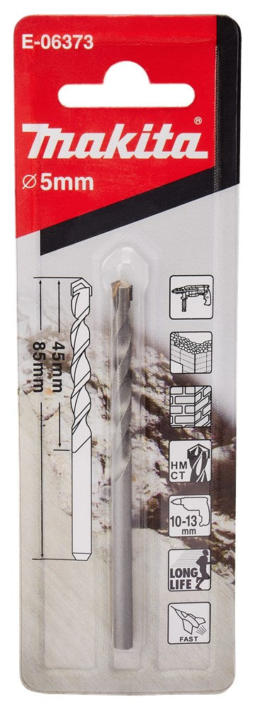 Makita steenboor 5x85mm voor klopboormachine, met cilindrische aansluiting. Deze boor heeft een extra brede spiraal om steengruis makkelijk af te voeren en een TCT versterkte centreerpunt. Geschikt voor het boren in baksteen, snelbouwsteen en kalkzandsteen.