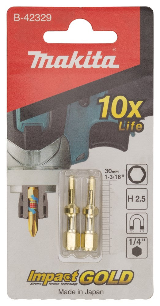 Makita schroefbits en slagschroefbits in verschillende lengtes en paskoppen. Voor elke klus is er een geschikte schroefbit beschikbaar. Kwalitatieve schroefbits in opbouw van Standaard, Impact Black, Impact Silver en Impact Gold naar Impact Premier. Inbus/Hex-bit H2.5 uit de Makita XTT Impact Gold-serie. Dankzij extreem hoog torsievermogen en perfecte pasvorm ideaal geschikt voor de slagschroevendraaier. Met 1/4" vorm E-opname in de lengte 30 mm. Twee H2.5-bits per verpakking.