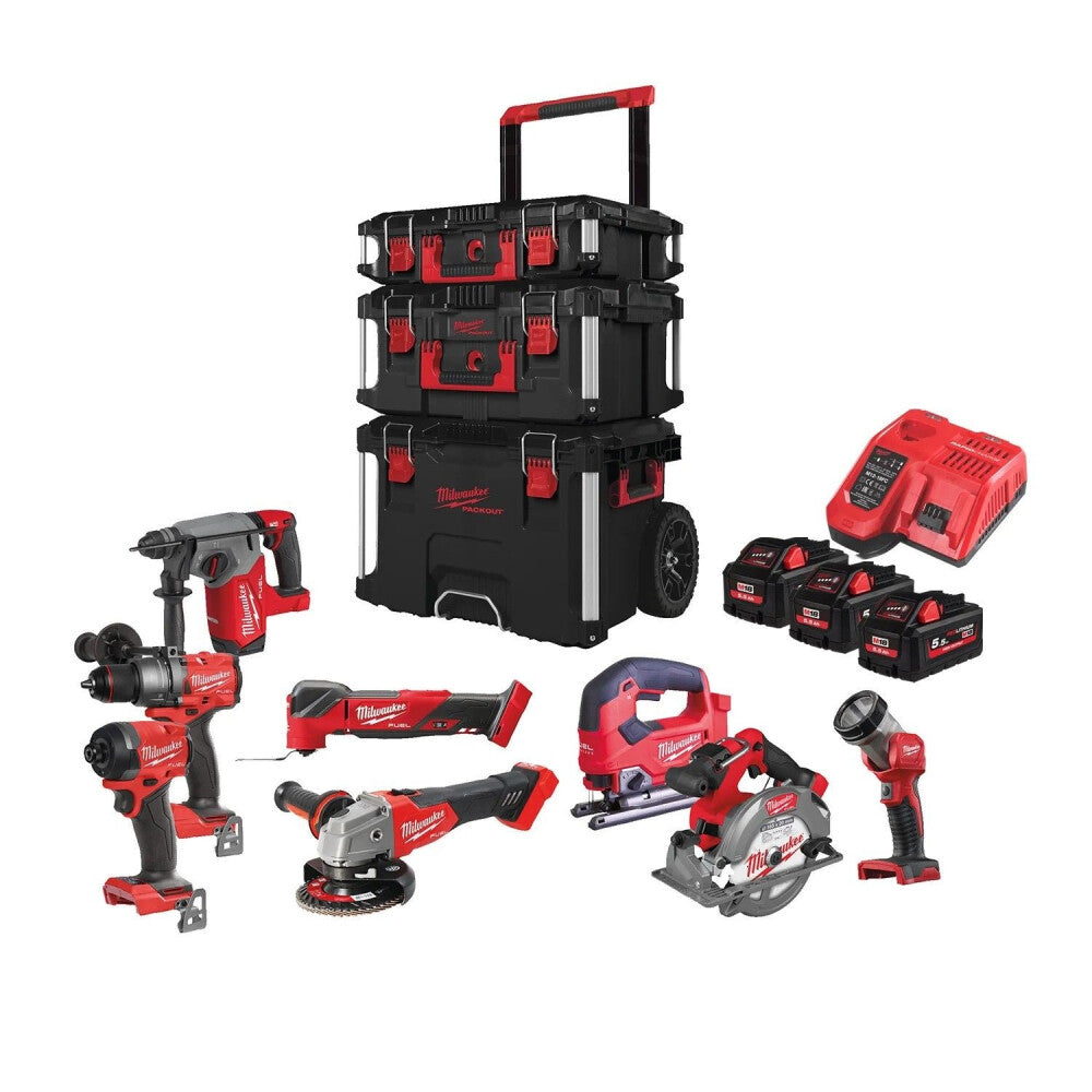 Set bevat: 8-delige Milwaukee M18 FUEL™ gereedschapsset met 18V 5.5Ah accu's, inclusief klopboormachine, slagschroevendraaier, combihamer, haakse slijper, decoupeerzaag, multitool, cirkelzaag en LED werklamp, verpakt in een PACKOUT™ Trol...