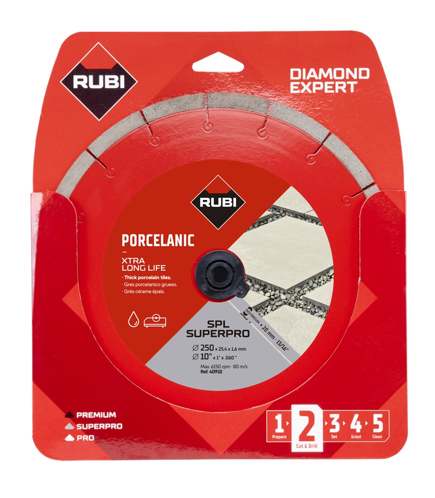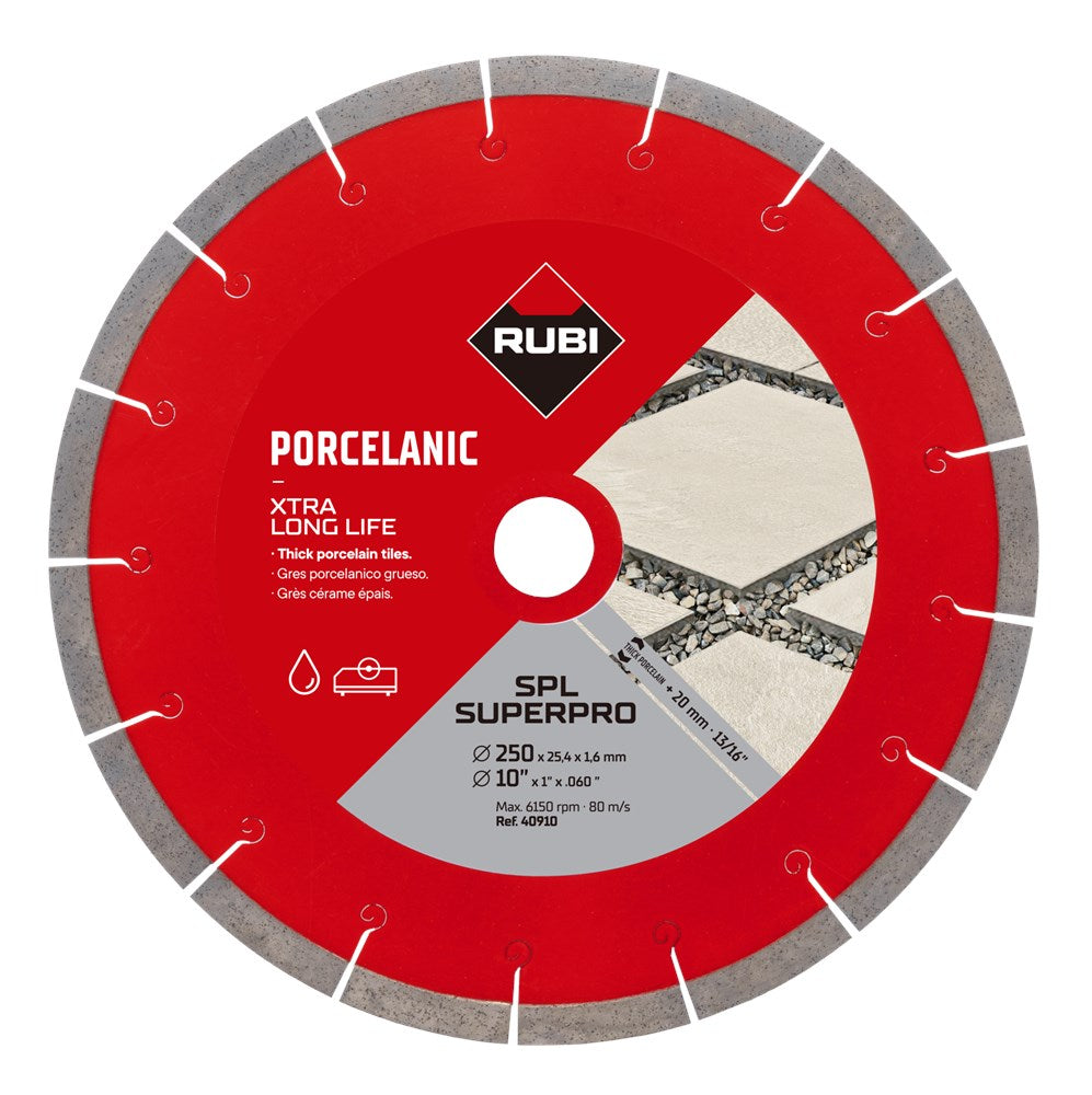 Het SPL- SUPERPRO zaagblad is speciaal ontworpen en aanbevolen voor het zagen van 20 mm dik porcellanato, door zijn samenstelling en type (J-SLOT) is de SPL SUPERPRO ook geschikt voor het zagen van keramiek, natuursteen en gesinterd steen van hoge hardheid. Door zijn zaagcapaciteit en veelzijdigheid is de SPL SUPERPRO bijzonder geschikt voor het zagen van harde materialen voor de hovenier.Als SUPERPRO-kwaliteitszaagblad biedt het de gebruiker een perfect uitgebalanceerd zaagresultaat en prestatie. De SPL SUPERPRO-zaagbladenreeks is verkrijgbaar in twee diameters: 250 mm en 300 mm, en is dus aangepast aan de belangrijkste modellen zaagmachines.De speciale legering van de diamantrand van de SPL SUPERPRO bladen maakt het mogelijk porcellanato stukken te zagen met een veel hogere snelheid en levensduur dan andere specifieke zaagbladen voor het zagen van porcellanato, mede dankzij het laserlassen van de diamanten ring. De weerstand van het SPL SUPERPRO zaagblad is buitengewoon.Rekening houdend met de bijzonderheden van elk type zaagblad (continue, turbo, enz.) en de materialen waarvoor deze zijn ontworpen, biedt RUBI de professional drie kwaliteiten zaagbladen: PRO, SUPERPRO en PREMIUM.De PRO-bladen bieden de professionele gebruiker de beste prijs-prestatieverhouding.SUPERPRO bladen benadrukken het belangrijkste kenmerk van elk zaagblad. Ze zijn de juiste keuze voor de meest veeleisende werkzaamheden.PREMIUM-zaagbladen zijn de meest gespecialiseerde optie. Altijd met de beste resultaten.RUBI adviseert het gebruik van geschikte kleding, veiligheidsschoenen, een veiligheidsbril, gehoorbescherming, hoofdbescherming, een stofmasker of een ander type ademhalingsapparaat.Bij het zagen met diamantzaagbladen moeten de instructies voor een veilig gebruik van de apparatuur strikt worden opgevolgd ter bescherming van de gebruiker en anderen in de omgeving van het zaaggebied.
