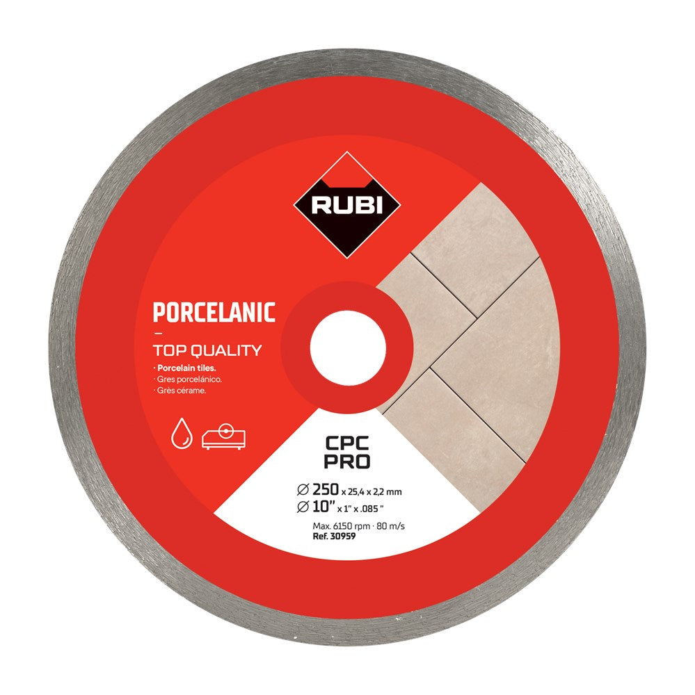 Momenteel is een van de grootste problemen voor de tegelzetter het zagen van porseleinen tegels.Bij RUBI weten we hoe mensen werken in alle landen van de wereld. We weten wat de tegelzetter vraagt van zijn gereedschap voor het plaatsen en repareren van tegels. Om deze redenen RUBI is een erkend merk en duidelijk is gericht op de professionele en veeleisende markt.De hoge eisen van onze klanten en de markt hebben geleid tot onze expertise in het ontwerpen van gereedschappen en producten om tegels zo nauwkeurig mogelijk te snijden en te plaatsen.Het resultaat hiervan is het CPC diamantzaagblad.Het CPC zaagblad van RUBI is ideaal voor het recht zagen en verstek zagen van porseleinen tegels, met name voor tegels die extreem hard zijn tot een dikte van 25 mm.De RUBI CPC zaagblad combineert verschillende metalen in de diamantrand samen met een van zeer hoge en fijne kwaliteit diamant. Dit zorgt ervoor dat wij een zaagblad, voor nat gebruik, kunnen aanbieden met tevreden klanten over de hele wereldBinnen deze serie zaagbladen heeft RUBI 2 verschillende kwaliteit bladen: PRO en SUPERPRO.De PRO zaagbladen geeft de gebruiker de beste prijs-kwaliteitverhouding.SUPERPRO bladen zijn als er meer wordt geëist van de zaagbladen in verband met een zwaardere klus.Bladen met een dikte van minder dan 2 mm zijn niet geschikt voor verstek zagen.