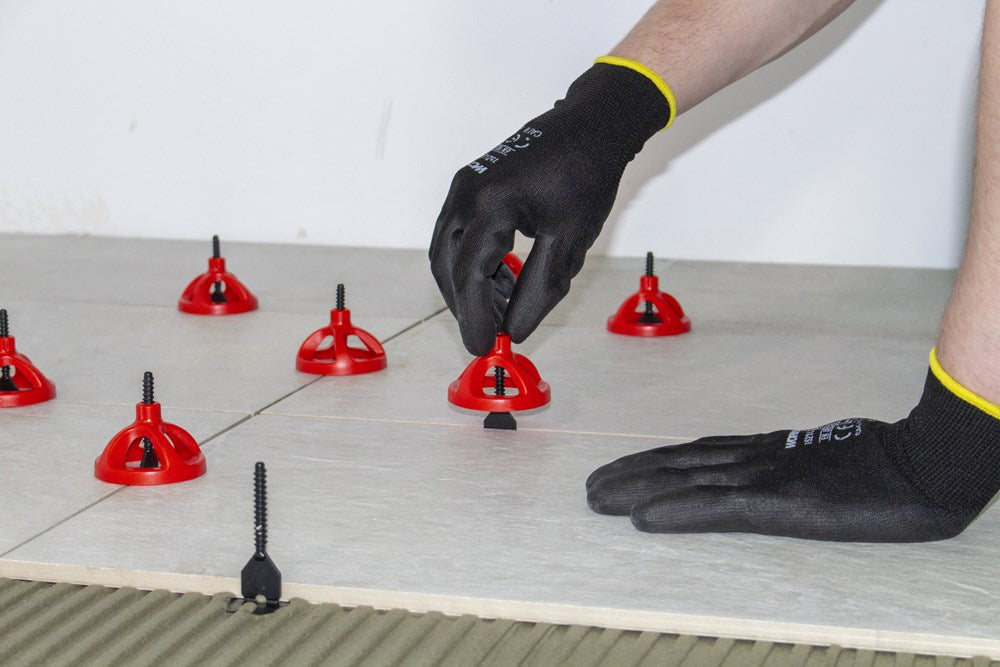 De belangrijkste functie van het CYCLONE LEVEL SYSTEEM is het voorkomen van onregelmatigheden tijdens het leggen van keramische tegels, zowel op vloeren als op wanden.De RUBI levelsystemen worden vooral aanbevolen bij het werken met grootformaat tegels. Hoewel ze ook met kleinere formaten kunnen worden gebruikt (aanbevolen vanaf 30x30 cm). Altijd met de dubbele verlijming techniek (buttering floating) en op een vlakke ondergrond.Het gebruik van het CYCLONE LEVEL SYSTEEM van RUBI, is zeer eenvoudig en intuïtief. Bovendien zijn de resultaten minder gevoelig voor de vaardigheid en ervaring van de gebruiker dan bij de andere levelsystemen op de markt.Het assortiment strips van het CYCLONE LEVEL SYSTEEM heeft verschillende diktes. Elke voegbreedte is gemakkelijk te identificeren dankzij de verschillende kleuren.De kapjes zijn herbruikbaar. De grote ronde basis zorgt voor een gelijkmatige druk op elk moment. Het ontwerp van de CYCLONE LEVEL SYSTEEM kapjes is speciaal bedacht om de ergonomie te maximaliseren tijdens het handmatig aanspannen (voor het CYCLONE LEVEL SYSTEEM is geen extra gereedschap nodig, niet voor het aanspannen, en ook niet voor het verwijderen) en voor de hoogst mogelijke zichtbaarheid binnen in het kapje zelf (om bijvoorbeeld te kunnen zien of er te veel lijm gebruikt is).Het verwijderen van het CYCLONE LEVEL SYSTEEM gebeurt door middel van een impulsbeweging (met de voet of een hamer) en, zoals we al eerder gezegd hebben, je hebt er geen extra gereedschap voor nodig.