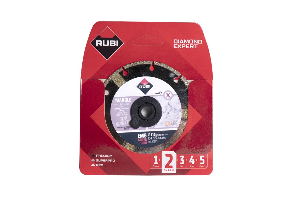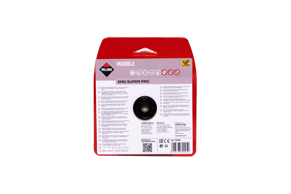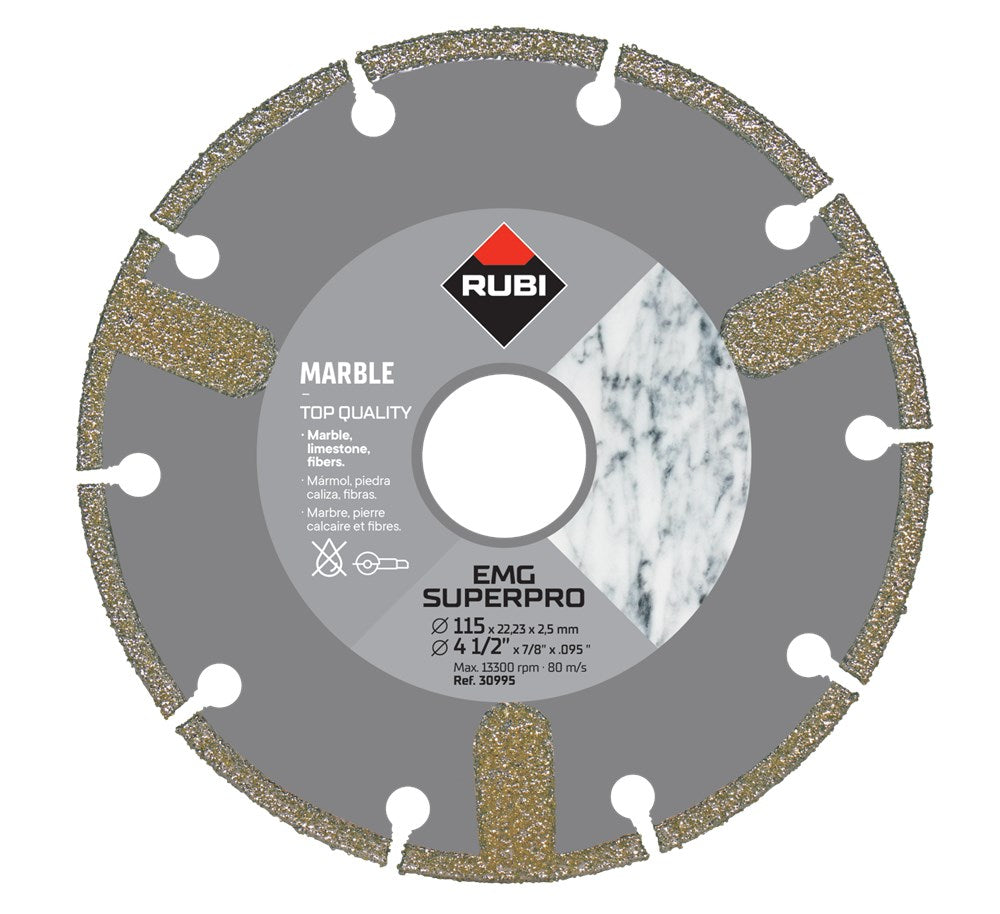 EMG zaagbladen van RUBI zijn gesegmenteerde zaagbladen.In tegenstelling tot andere zaagbladen van RUBI is het diamant bij de EMG zaagbladen niet gebonden door middel van lassen maar zijn de gegalvaniseerde diamantkorrels direct op het blad bevestigd.Het RUBI EMG gegalvaniseerde zaagblad biedt een hoge duurzaamheid mits u hem gebruikt voor de materialen waarvoor het wordt aanbevolen. We moeten in gedachten houden dat het diamant op de gegalvaniseerde zaagbladen niet beschermd worden door bindmiddel, zodat bij verkeerd gebruik, het diamant kan beschadigen en dat heeft effect op de levensduur van het blad.Het RUBI EMG zaagblad is aanbevolen voor het zagen van marmer, kalksteen of synthetische materialen zoals PVC.Het gebruik van gegalvaniseerde diamantschijven zoals de RUBI EMG, reduceert de trillingen bij het droogzagen met een slijpmachine.Binnen deze serie zaagbladen heeft RUBI 2 verschillende kwaliteit bladen, De PRO en SUPERPRO.De PRO zaagbladen geeft de gebruiker de beste prijs-kwaliteitverhoudingSUPERPRO bladen zijn als er meer wordt geëist van de zaagbladen in verband met een zwaardere klus.Bladen met een dikte van minder dan 2 mm zijn niet geschikt voor verstek zagen.