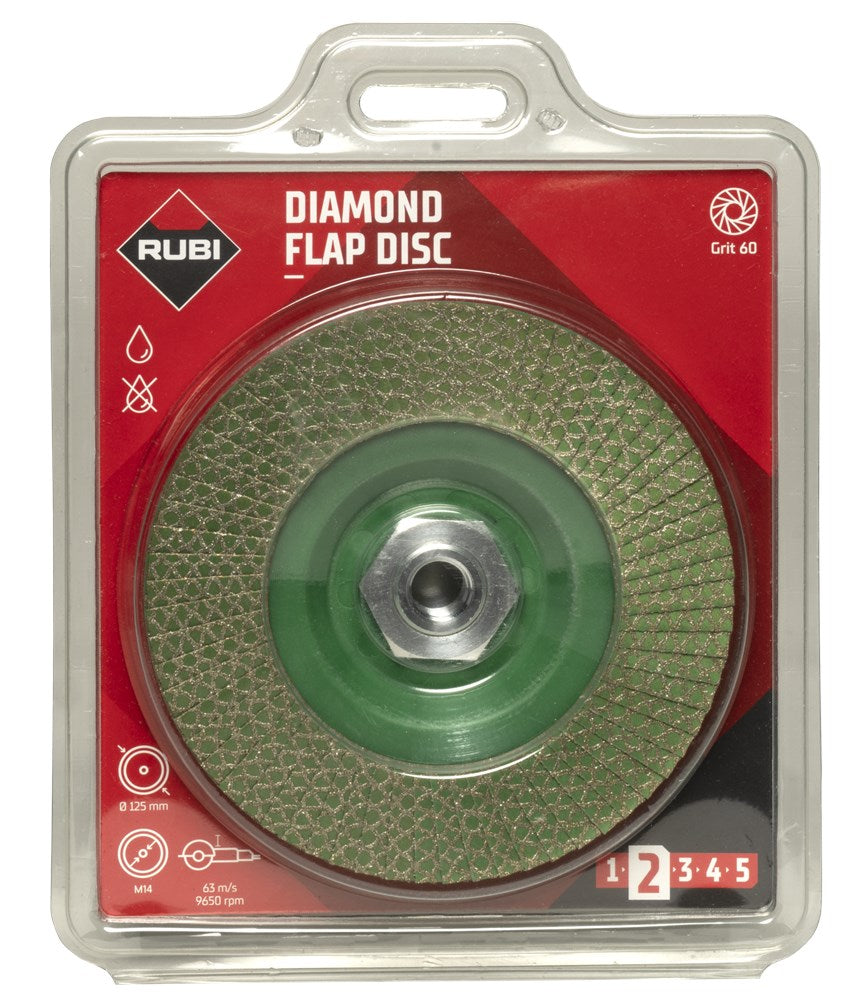 Het assortiment FLAP DISCS (lamellenschijven) wordt speciaal aanbevolen voor het slijpen van keramische tegels, porcellanato, gesinterde steen en natuursteen. Deze bladen zijn sterk aanbevolen voor het slijpen van randen en kleine oppervlakken, dus uitstekend geschikt voor het uitvoeren van verstekken en facetten met de haakse slijper. FLAP DISCS zijn uitgevoerd met een aluminium adapter met M14 koppelschroefdraad, die rechtstreeks op de uitgaande as past van iedere haakse slijper. Deze aluminium adapter zorgt voor minder trillingen en een betere stabiliteit tijdens het werk.Het gamma FLAP DISCS is beschikbaar in twee diameters: 115 mm en 125 mm en elk in verschillende korrelgroottes om zowel een adequaat slijpproces als de beste eindafwerking te garanderen. De beschikbare korrelgroottes zijn: - #50/60 - Voor het eerste en meer agressieve opruwen. - #100/120 - Voor het medium opruwen. - #200 - Voor de perfecte afwerking.De maximale aanbevolen gebruikssnelheid is 10.500 rpm (diameter 115 mm) en 9.650 rpm (diameter 125 mm).