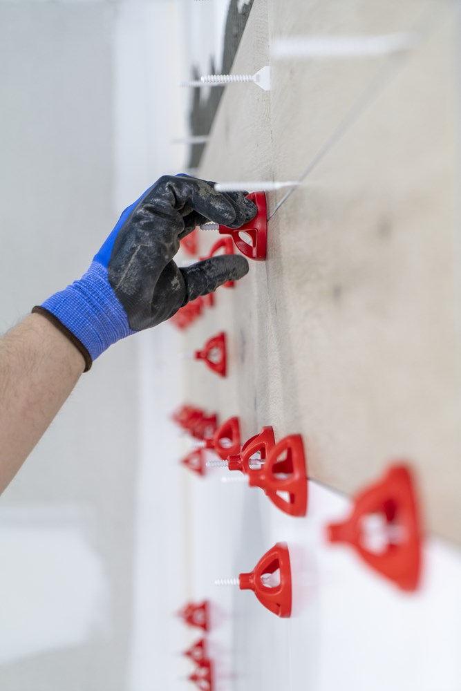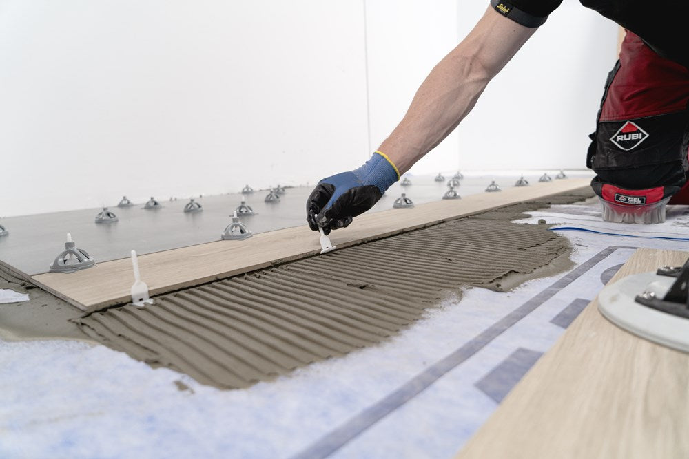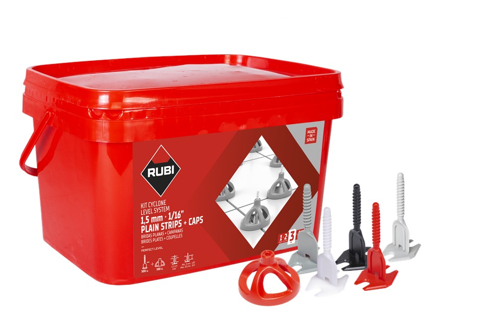 De belangrijkste functie van het CYCLONE LEVEL SYSTEEM is het voorkomen van onregelmatigheden tijdens het leggen van keramische tegels, zowel op vloeren als op wanden.De RUBI levelsystemen worden vooral aanbevolen bij het werken met grootformaat tegels. Hoewel ze ook met kleinere formaten kunnen worden gebruikt (aanbevolen vanaf 30x30 cm). Altijd met de dubbele verlijming techniek (buttering floating) en op een vlakke ondergrond.Het gebruik van het CYCLONE LEVEL SYSTEEM van RUBI, is zeer eenvoudig en intuïtief. Bovendien zijn de resultaten minder gevoelig voor de vaardigheid en ervaring van de gebruiker dan bij de andere levelsystemen op de markt.Het assortiment strips van het CYCLONE LEVEL SYSTEEM heeft verschillende diktes en bestaat uit vlakke strips, t-strips en kruisstrips. De kruis- en t-strips zijn op de hoeken van de tegel te gebruiken en kunnen ook als vervanging* van de traditionele tegelvoegkruisjes ingezet worden. Elke voegbreedte is gemakkelijk te identificeren dankzij de verschillende kleuren.De kapjes zijn herbruikbaar. De grote ronde basis zorgt voor een gelijkmatige druk op elk moment. Het ontwerp van de CYCLONE LEVEL SYSTEEM kapjes is speciaal bedacht om de ergonomie te maximaliseren tijdens het handmatig aanspannen (voor het CYCLONE LEVEL SYSTEEM is geen extra gereedschap nodig, niet voor het aanspannen, en ook niet voor het verwijderen) en voor de hoogst mogelijke zichtbaarheid binnen in het kapje zelf (om bijvoorbeeld te kunnen zien of er te veel lijm gebruikt is).Het verwijderen van het CYCLONE LEVEL SYSTEEM gebeurt door middel van een impulsbeweging (met de voet of een hamer) en, zoals we al eerder gezegd hebben, je hebt er geen extra gereedschap voor nodig.*Alleen de kruis- en t-strips zijn vervangers voor tegelvoegkruisjes.