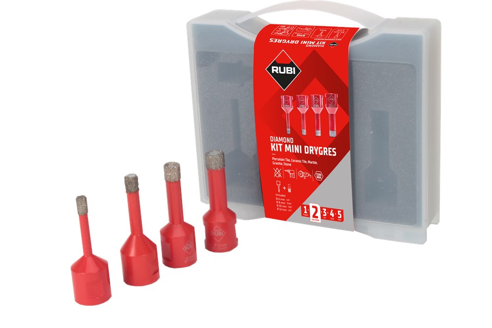 De boren in de MINI DRYGRES set zijn aanbevolen voor het boren van alle soorten tegels en andere wand- of vloermaterialen zoals marmer en graniet.Voor de boren in de MINI DRYGRES set heeft RUBI een vacuüm gesoldeerde technologie gebruikt, die de weerstand tegen temperatuur en wrijving verhoogt, om zo de levensduur van de diamantboor te verhogen.De MINI DRYGRES borenset met diameters 6-12 mm is perfect voor het installeren van badkameraccessoires.De MINI DRYGRES borenset is gemaakt om droog mee te boren en kan worden gebruikt via M14 draadverbinding op een slijpmachine of door middel van een booradapter (ref. 05976) op een boormachine.De gemiddelde levensduur van de MINI DRYGRES boren (6-12 mm) is 15 tot 25 gaten.De gemiddelde levensduur van de boren is altijd afhankelijk van het soort materiaal, de dikte, een goede koeling en de toepassing.De boordiepte van DRYGRES boren is 36 mm.De diameters van 6, 8, 10 en 12 mm van de MINI DRYGRES set bevatten wax binnen. Dit wax smelt tijdens het boren en dit bevordert de koeling en de afvoer van boorresten bij de boorkop. Als de wax op is dan kan de boor gewoon gebruikt worden. Alleen slijtage aan het diamant op de boorkop kan bepalen wanneer de boor versleten is.Het boren in de MINI DRYGRES kit bevatten wax binnen. Dit was smelt tijdens het gebruik van de boor en vergemakkelijkt koeling en de evacuatie van het boren blijft. Voordat u verder boren moeten we ervoor zorgen binnen de boor dat er geen keramische resten worden achtergelaten in de gestolde was.De maximumsnelheid voor het gebruik van DRYGRES diamantboren is 14.000 rpmVoor een betere afwerking en langere duur van de boor, is het belangrijk om de geadviseerde rotatiesnelheid aan te houden en om met de boor een draaiende beweging te maken tijdens het boren.