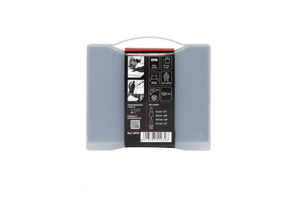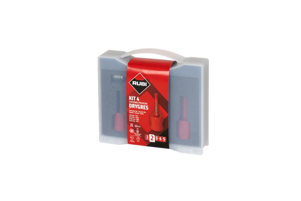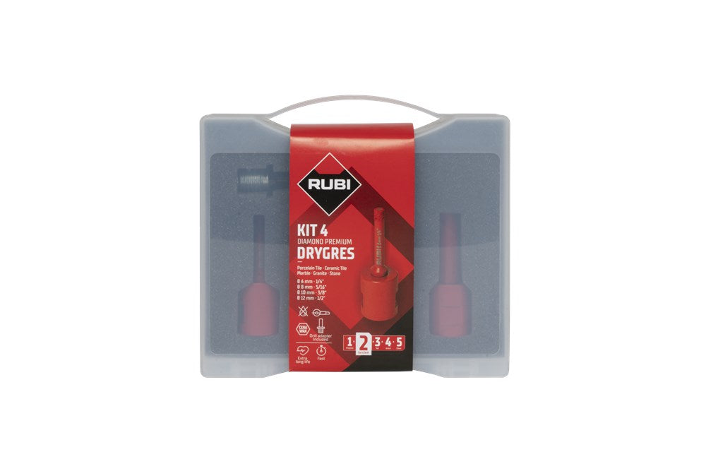 De MINI DRYGRES PREMIUM kit is perfect voor de installatie van badkameraccessoires of elk type decoratief accessoire op keramische oppervlakken.De MINI DRYGRES PREMIUM kit bestaat uit 4 boren in de volgende maten: Ø 6, 8, 10 en 12 mm (van elk 1 stuk), een booradapter (ref. 05976) en een praktische koffer. Het assortiment boren in de MINI DRYGRES PREMIUM kit wordt aanbevolen voor het boren in alle soorten keramische tegels, met name porseleinen tegels, en andere wand- of vloertegels zoals marmer en graniet. In de boren van de MINI DRYGRES PREMIUM kit heeft RUBI de VACUUM BRAZED vacuümsoldeertechnologie gebruikt, die de weerstand tegen hoge temperaturen en wrijving verhoogt, door de diamantdeeltjes in het boorgedeelte vast te zetten.DRYGRES PREMIUM diamantboren zijn gemaakt om droog mee te boren en kunnen, dankzij hun M14 schroefdraadaansluiting, rechtstreeks op een haakse slijper worden bevestigd op of op een boormachine via de booradapter (ref. 05976).De gemiddelde levensduur van de MINI DRYGRES PREMIUM diamantboren (Ø 6 tot 12 mm) bedraagt 60 gaten. De gemiddelde levensduur van de boren hangt ALTIJD af van het soort materiaal, de dikte ervan en de juiste koeling en het juiste gebruik.De boordiepte van de DRYGRES PREMIUM diamantboren bedraagt 30 mm. De diamantboren van de MINI DRYGRES PREMIUM kit bevatten wax. Deze wax smelt tijdens het gebruik van de boor en vergemakkelijkt koeling en de stofbinding. Zorg ervoor dat er geen keramische resten achter zijn gebleven in de gestolde wax voordat je verder gaat met boren. Als de wax op is, kun je de boor blijven gebruiken. Alleen het totale verlies van de diamant geeft het einde van de levensduur van de boor aan.De maximumsnelheid voor het gebruik van DRYGRES diamantboren is 14.000 rpm.Voor een betere afwerking en langere levensduur van de boor, is het belangrijk om de geadviseerde rotatiesnelheid aan te houden en om met de boor een pendelende beweging te maken tijdens het boren.