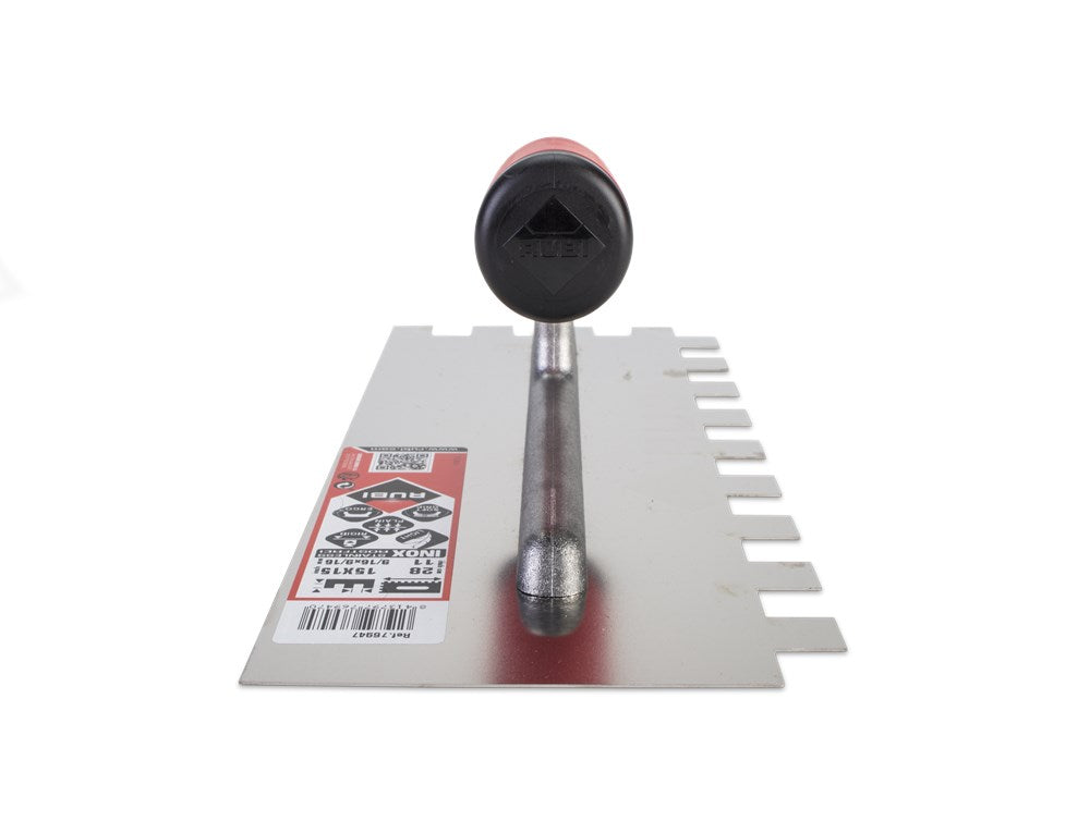 De troffels en gekerfd troffels met open RUBIFLEX handgrepen hebben een extreem lichtgewicht en aluminium versterking.De versterking en de plaat zijn zeer vast bevestigd door middel van drukbouten die eenmaal gemonteerd zijn onmogelijk te verwijderen zonder dat het effect heeft op de unitaire karakter van het gereedschap.De troffels en gekerfd troffels met open RUBIFLEX handgrepen hebben een speciale hoge slijtvaste stalen plaat en corrosiebescherming met kleurloze lak. (STAAL).Er zijn ook modellen met een speciale hoge slijtvaste roestvrij stalen plaat.Een van de kenmerken van alle RUBI troffels en inkeping troffels is de perfecte vlakheid van de plaat.Alle modellen van troffels en gekerfd troffels in deze reeks hebben de exclusieve RUBIFLEX ergonomische handgreep met twee texturen. Een zeer ergonomisch handgreep met een verhoogde grip.Troffel en lijmkam modellen met open handgrepen vergemakkelijken controle bij het aanbrengen van materiaal. Een van de voordelen die professionele tegelzetter vinden aan dit type handgreep, dankzij zijn opening, kan het gereedschap worden opgehangen aan de rand van de bak, kuip of een andere voorwerp waarin het aan te brengen materiaal zit. Hiermeekunt u de troffel of lijmkam ten allen tijde handig en schoon houden.Een ander aspect dat het RUBI assortiment troffels en lijmkammen onderscheid van de rest is het brede scala van modellen en afmetingen van de inkepingen.Bij de toepassing van lijmen voor de montage van keramische tegels, moet er altijd rekening gehouden worden met de open en hardingstijden van elke fabrikant.Daarnaast, als onderdeel van de strategie, wordt bij RUBI continu onderzoek gedaan op basis van de evolutie van de gereedschappen en op basis van de eisen van de door toonaangevende keramische tegel fabrikantenwereldwijd, 30.000 RUBI dealers en meer dan 40.000 eindgebruikers die geregistreerd zijn bij de RUBI club. Als gevolg van al deze factoren, biedt RUBI professionele tegelzetters de meest uitgebreide en geschikt bereik van tools op de markt. Alles wat je nodig hebt voor alle fasen van de verwerking van keramische tegels.