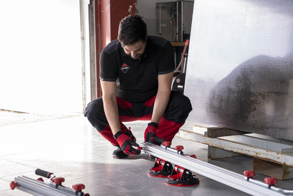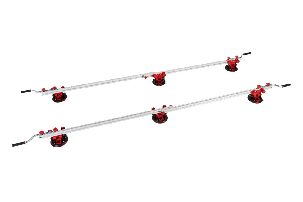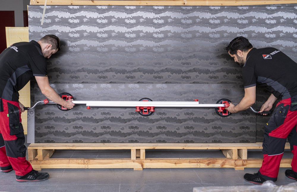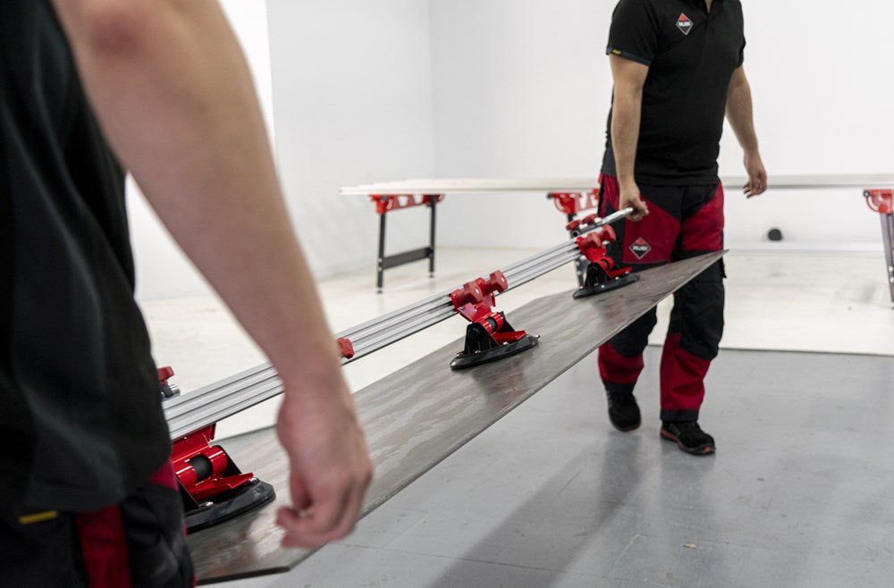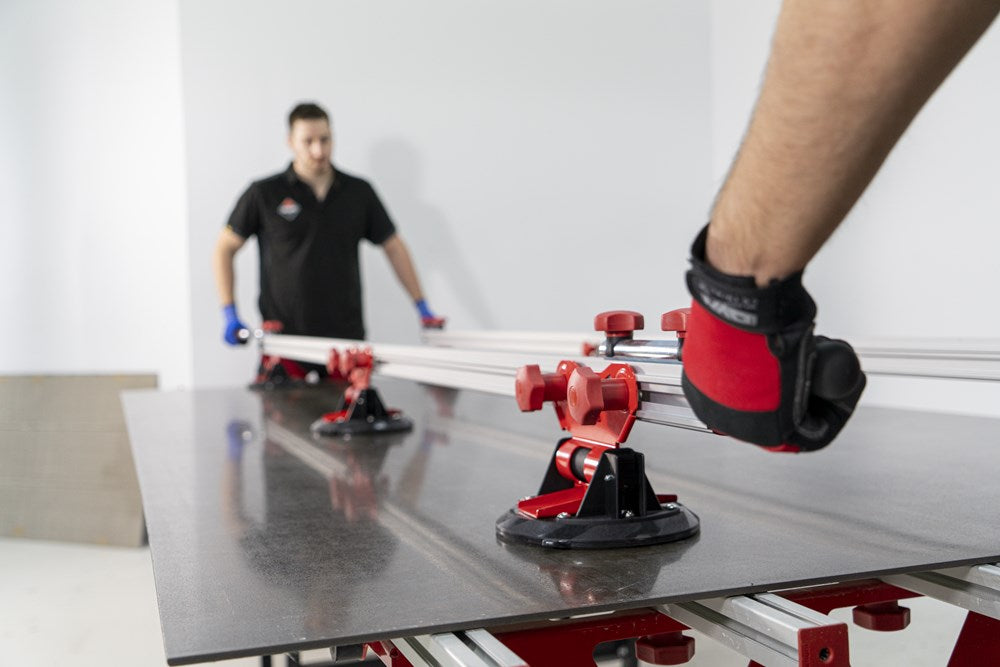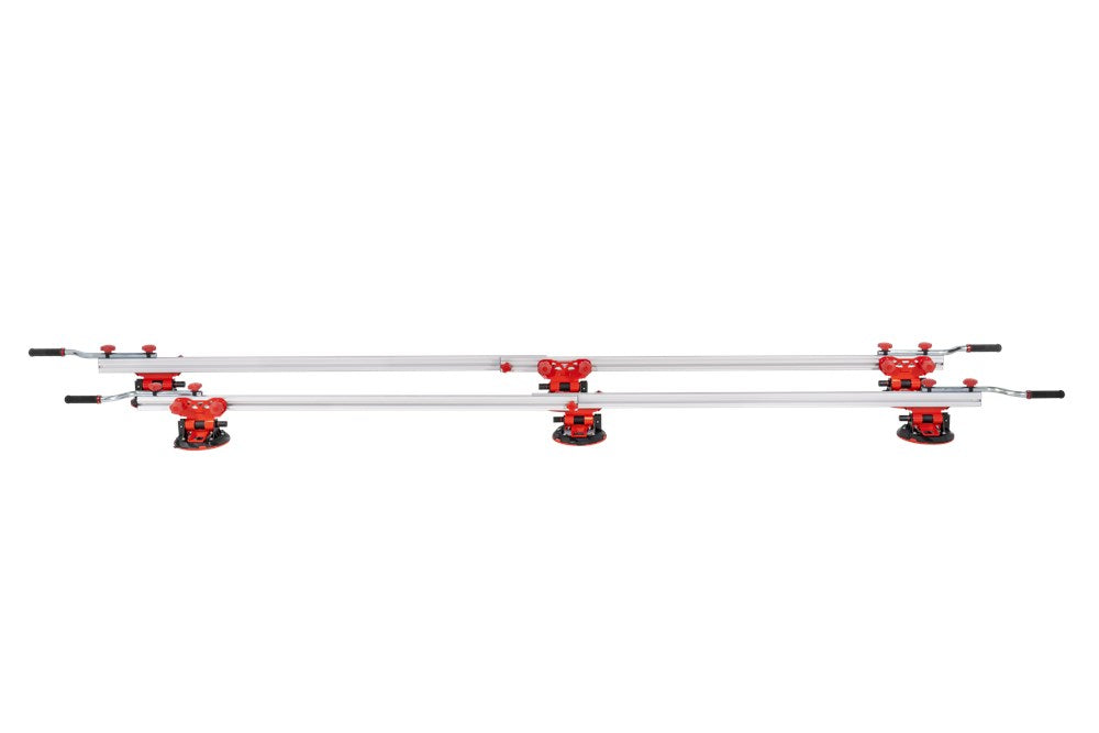 Het SLIM EASY TRANS PLUS transportsysteem is ontworpen voor de handling van platen met een maximale dikte van 6 mm. Dankzij het systeem van inschuifbare versterkte aluminiumprofielen kan de SLIM EASY TRANS PLUS keramische platen tot een maximale lengte van 320 cm verwerken. Deze intrekbare profielen kunnen in lengte worden versteld van 170 cm tot maximaal 320 cm.De handgrepen, die ook verstelbaar zijn, zijn voorzien van soft-grip handgrepen voor meer ergonomie en comfort tijdens het hanteren. De handgrepen van de SLIM EASY TRANS PLUS glijden door de bovenste gleuf van de intrekbare geleiders, wat de opslag en het transport van het hele systeem vergemakkelijkt.Het transportvermogen van de SLIM EASY TRANS PLUS is 80 kg, maar als de DWARSBALKENSET (ref. 18819) wordt toegevoegd, neemt het draagvermogen toe tot maximaal 120 kg. Met behulp van de DWARSBALKENSET (ref. 18819) op de SLIM EASY TRANS PLUS, wordt het systeem ook compatibel gemaakt met de SLAB TROLLEY (ref. 18934).De SLIM EASY TRANS PLUS is voorzien van 6 vacuümzuignappen met een diameter van 20 cm en een hoog draag- en vasthoudvermogen. De zuignappen kunnen worden verschoven en hun positie kan worden aangepast aan het formaat van de plaat. De vacuüm pad zorgt voor extra veiligheid en betrouwbaarheid bij het vastzetten van het materiaal. OPMERKING: Het toevoegen van meer zuignappen verhoogt het maximale draagvermogen van de SLIM EASY TRANS PLUS niet. De zuignappen van de SLIM EASY TRANS PLUS zijn niet compatibel met de SLIM EASY TRANS (ref. 18910), en omgekeerd zijn de zuignappen van de SLIM EASY TRANS PLUS ook niet compatibel met de SLIM EASY TRANS PLUS.RUBI beveelt het gebruik van de TROLLEY en individuele veiligheidselementen aan bij het hanteren van zware lasten. De hantering van deze materialen moet worden uitgevoerd door het aantal personen dat nodig is volgens de waarden voor de maximale belasting van één persoon.