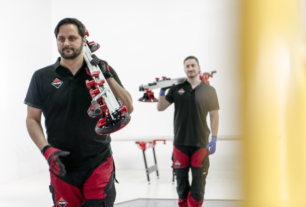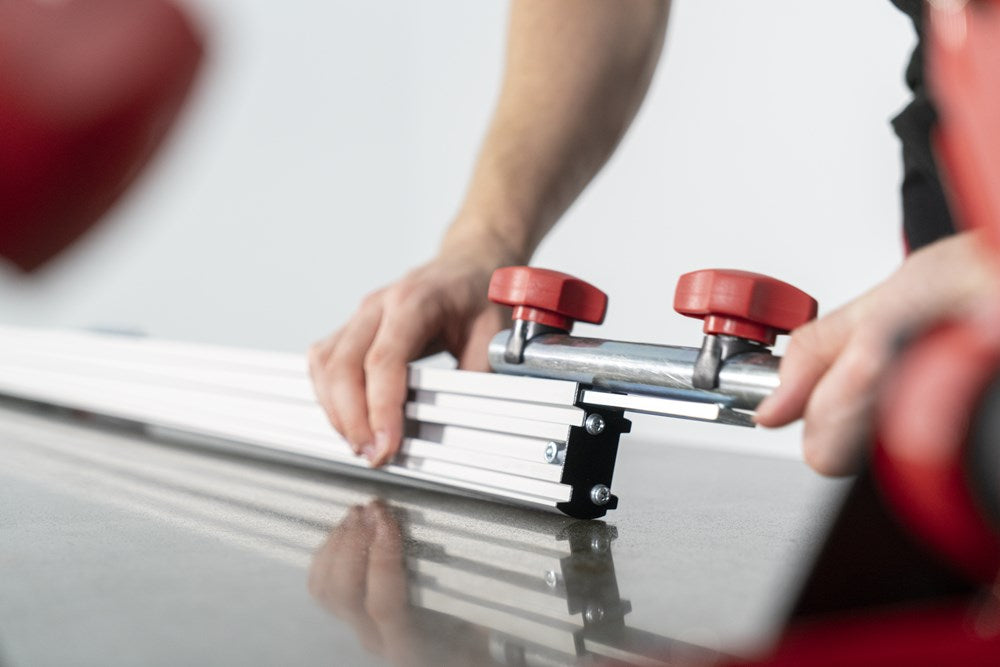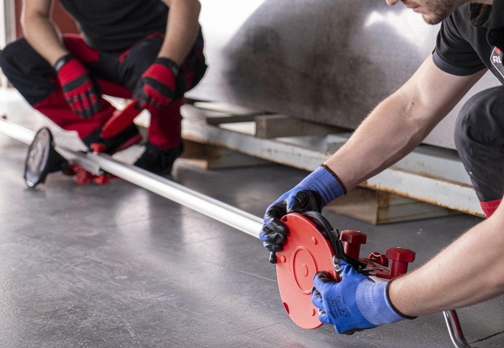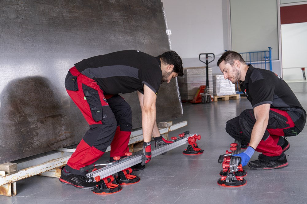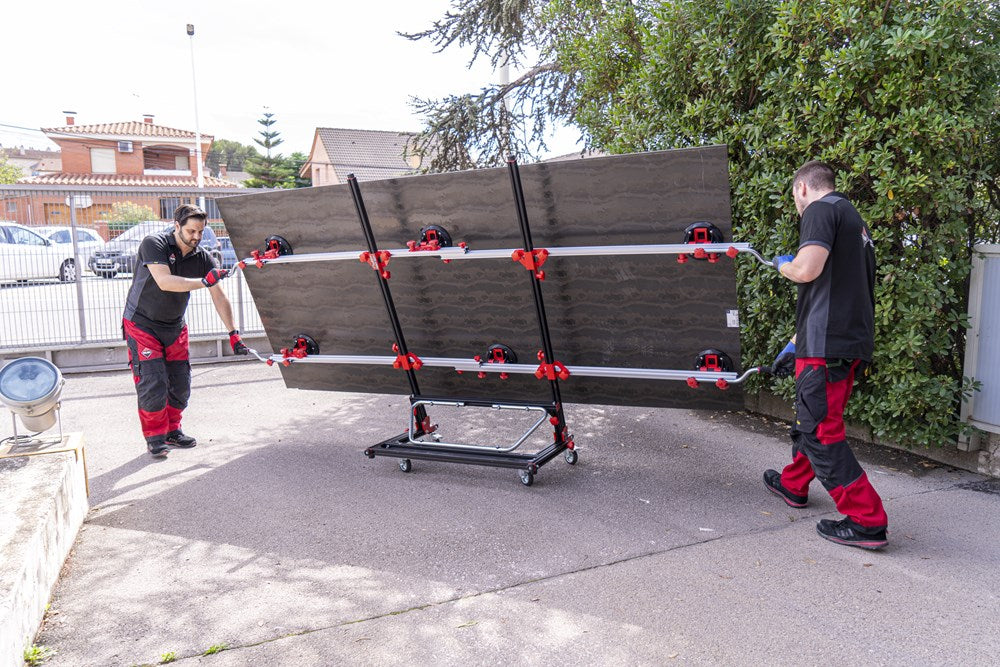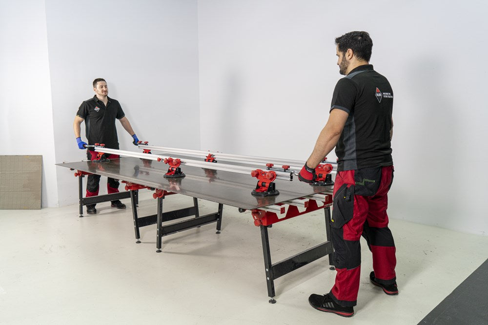 Het SLIM EASY TRANS PLUS transportsysteem is ontworpen voor de handling van platen met een maximale dikte van 6 mm. Dankzij het systeem van inschuifbare versterkte aluminiumprofielen kan de SLIM EASY TRANS PLUS keramische platen tot een maximale lengte van 320 cm verwerken. Deze intrekbare profielen kunnen in lengte worden versteld van 170 cm tot maximaal 320 cm.De handgrepen, die ook verstelbaar zijn, zijn voorzien van soft-grip handgrepen voor meer ergonomie en comfort tijdens het hanteren. De handgrepen van de SLIM EASY TRANS PLUS glijden door de bovenste gleuf van de intrekbare geleiders, wat de opslag en het transport van het hele systeem vergemakkelijkt.Het transportvermogen van de SLIM EASY TRANS PLUS is 80 kg, maar als de DWARSBALKENSET (ref. 18819) wordt toegevoegd, neemt het draagvermogen toe tot maximaal 120 kg. Met behulp van de DWARSBALKENSET (ref. 18819) op de SLIM EASY TRANS PLUS, wordt het systeem ook compatibel gemaakt met de SLAB TROLLEY (ref. 18934).De SLIM EASY TRANS PLUS is voorzien van 6 vacuümzuignappen met een diameter van 20 cm en een hoog draag- en vasthoudvermogen. De zuignappen kunnen worden verschoven en hun positie kan worden aangepast aan het formaat van de plaat. De vacuüm pad zorgt voor extra veiligheid en betrouwbaarheid bij het vastzetten van het materiaal. OPMERKING: Het toevoegen van meer zuignappen verhoogt het maximale draagvermogen van de SLIM EASY TRANS PLUS niet. De zuignappen van de SLIM EASY TRANS PLUS zijn niet compatibel met de SLIM EASY TRANS (ref. 18910), en omgekeerd zijn de zuignappen van de SLIM EASY TRANS PLUS ook niet compatibel met de SLIM EASY TRANS PLUS.RUBI beveelt het gebruik van de TROLLEY en individuele veiligheidselementen aan bij het hanteren van zware lasten. De hantering van deze materialen moet worden uitgevoerd door het aantal personen dat nodig is volgens de waarden voor de maximale belasting van één persoon.