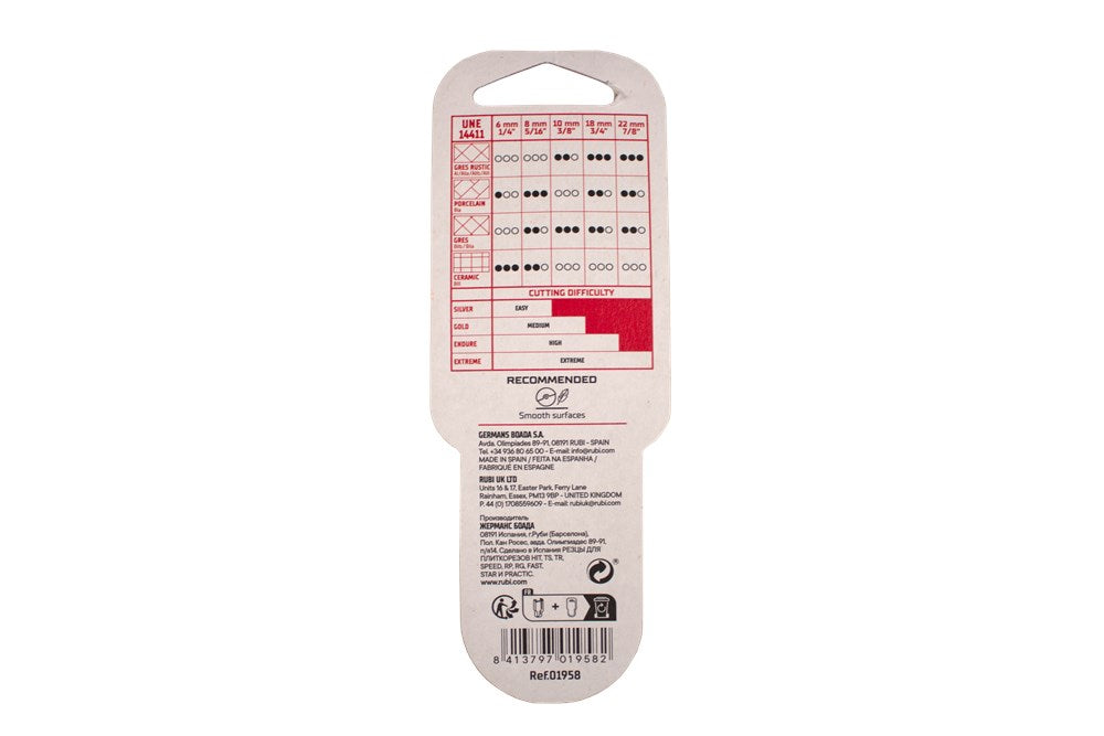 RUBI's SILVER snijwieltjes zijn gemaakt van gesinterd wolfraamcarbide. Elk wieltje wordt individueel geslepen zodat elke diameter een insnijhoek heeft in overeenstemming met zijn functie en gebruik. Elke diameter biedt verschillende resultaten en prestaties, afhankelijk van het type keramisch materiaal.De hoge slijtvastheid garandeert de professional een kwalitatief hoogstaande afwerking.De SILVER snijwieltjes zijn geschikt voor: tegels (BIII), geglazuurd steengoed (BIb - BIIa), rustiek of geëxtrudeerd steengoed (AIb - AII) en natuurlijk porseleinen steengoed (BIa), met lage tot middelmatige snijproblemen.De SILVER snijwieltjes zijn voornamelijk ontworpen om te werken met keramische materialen met geglazuurde of natuurlijke oppervlakken met een gladde en/of licht ruwe afwerking.De houders van de SILVER hebben een drievoudige groefgeometrie (RUBI-design en -octrooi), om een correcte montage op de tegelsnijder te garanderen.De SILVER snijwieltjes zijn verkrijgbaar in twee uitvoeringen, zodat ze kunnen worden gebruikt voor het hele RUBI-assortiment van tegelsnijders. Zoals de TR-MAGNET, TS-MAX, SPEED-MAGNET, SPEED-N, FAST, STAR-MAX, STAR, POCKET en PRACTIC. De snijwieltjes compatibel met de TZ en TX-MAX.