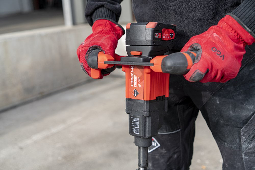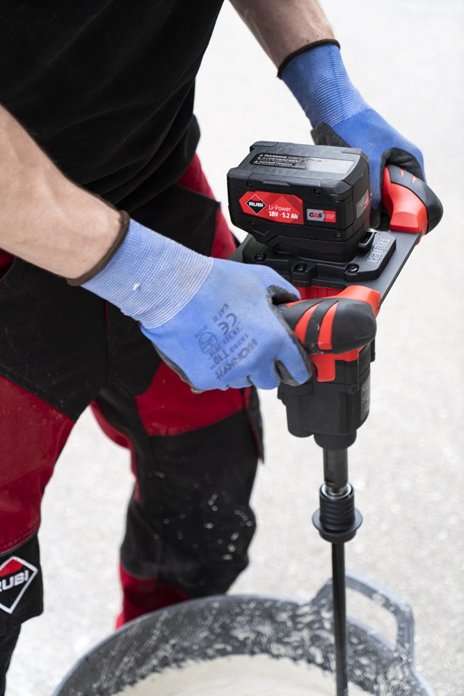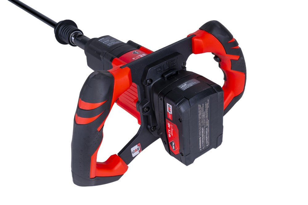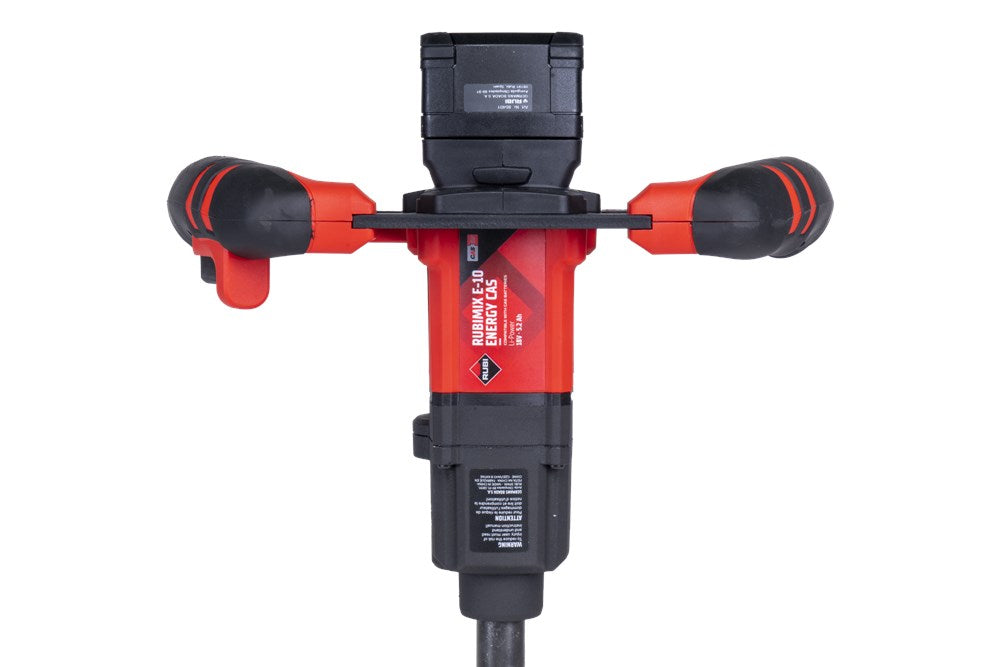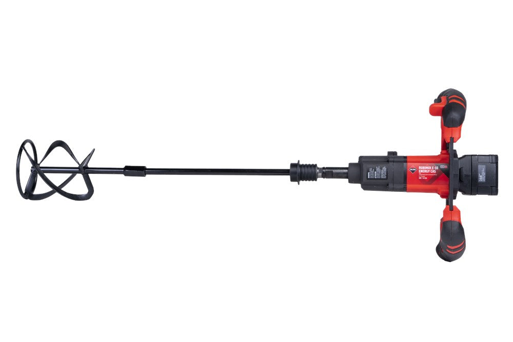 De RUBIMIX E-10 ENERGY CAS elektrische mixer op accu is ideaal voor het mengen van cementgebonden lijmen, harsen, verven en andere materialen.De belangrijkste voordelen van de RUBIMIX E-10 ENERGY CAS mixer zijn transport, eenvoudige bediening en het gemak om niet afhankelijk te zijn van een stopcontact en de vrijheid en veiligheid van het werken zonder kabels.De RUBIMIX E-10 ENERGY CAS is uitgerust met een BORSTELLOZE motor, is onderhoudsvrij en verlengt de levensduur van het product aanzienlijk.Met de 18V - 5,2Ah Li-Ion ENERGY CAS accu sluit RUBI zich aan bij het METABO CAS platform. De ENERGY CAS Li-Ion accu is compatibel met de meer dan 300 producten die deel uitmaken van het CAS (Cordless Alliance System) platform en biedt een autonomie tot 90 liter (3 zakken keramische lijm). Met de ENERGY CAS lader is de volledige oplaadtijd van de accu ongeveer 180 minuten.De ENERGY CAS Li-Ion accu heeft een LED-display dat het resterende oplaadniveau aan de gebruiker aangeeft. Als het display4 groene LED's toont, betekent dit dat de accu 100% capaciteit heeft.De dubbele handgreep met bi-materiaal grip biedt meer ergonomie en comfort voor de gebruiker, en de geometrie vergemakkelijkt een betere controle en stabiliteit van het gereedschap tijdens het mengen.De mechanische versnellingsbak heeft twee snelheden. Deze worden zeer efficiënt geregeld door de elektronische regelaar.Om de veiligheid van de mixer te verhogen en onbedoeld starten te voorkomen, is de RUBIMIX E-10 ENERGY CAS uitgerust met een schakelaarvergrendelingssysteem op de handgreep.De RUBIMIX E-10 ENERGY CAS is standaard uitgerust met RUBI's exclusieve FAST-IN snelkoppelingssysteem, waarmee de gebruiker de mengstaaf snel en zonder gereedschap kan monteren en demonteren. Dit zorgt voor een beter transport en onderhoud van de mixer.Samen met de mixer wordt een verwisselbare mengstaaf met een diameter van 120 mm (maximale capaciteit van de mixer) geleverd, speciaal voor mortels en cementgebonden lijmen met FAST-IN aansluiting.