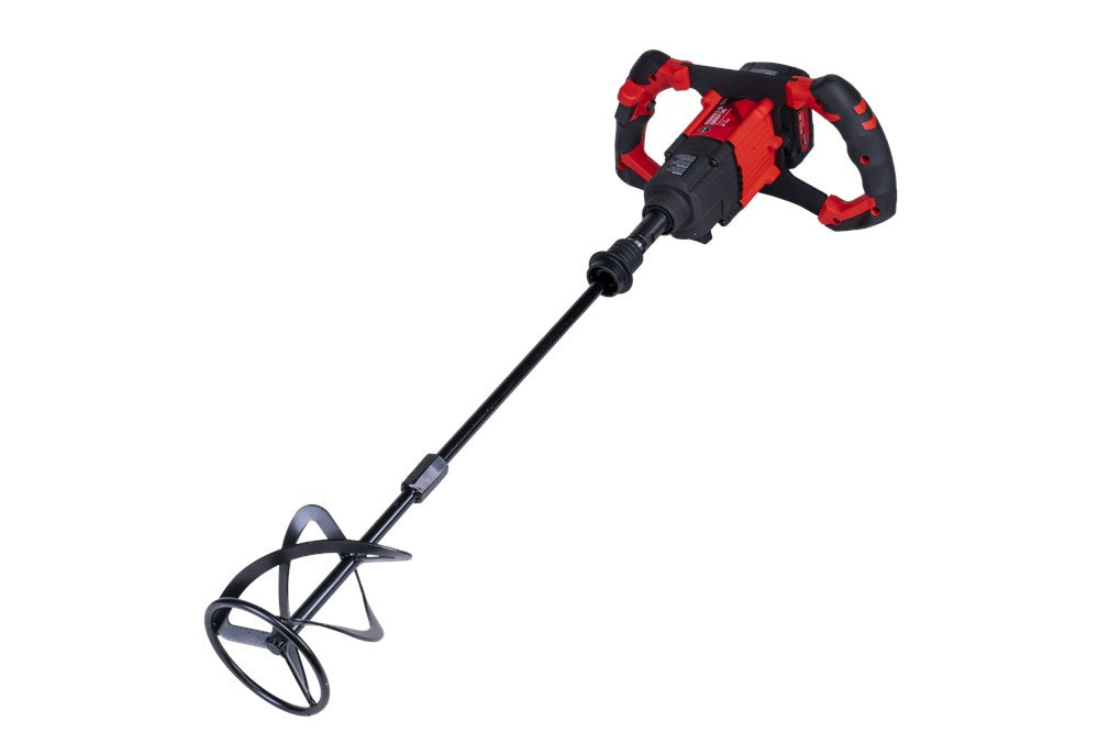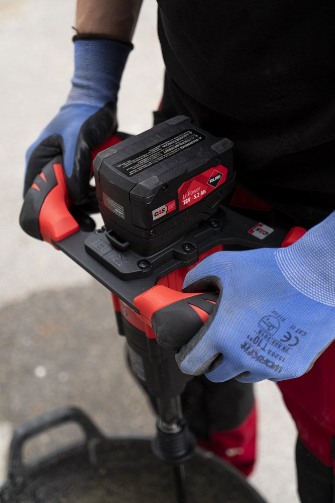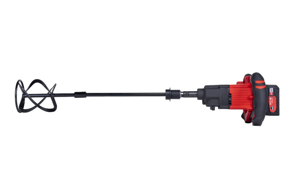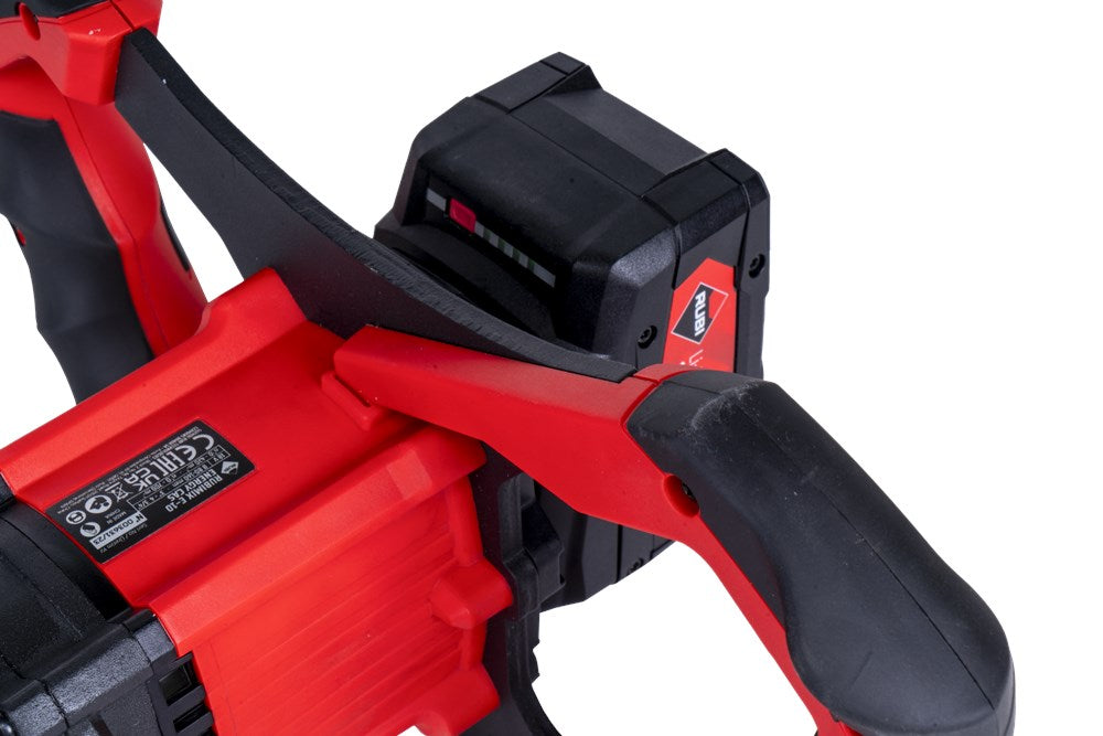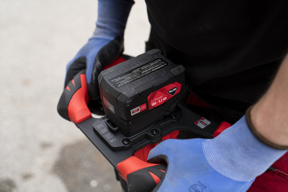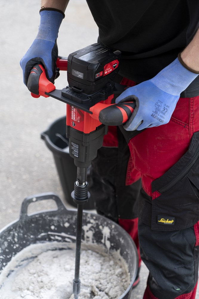 De RUBIMIX E-10 ENERGY CAS elektrische mixer op accu is ideaal voor het mengen van cementgebonden lijmen, harsen, verven en andere materialen.De belangrijkste voordelen van de RUBIMIX E-10 ENERGY CAS mixer zijn transport, eenvoudige bediening en het gemak om niet afhankelijk te zijn van een stopcontact en de vrijheid en veiligheid van het werken zonder kabels.De RUBIMIX E-10 ENERGY CAS is uitgerust met een BORSTELLOZE motor, is onderhoudsvrij en verlengt de levensduur van het product aanzienlijk.Met de 18V - 5,2Ah Li-Ion ENERGY CAS accu sluit RUBI zich aan bij het METABO CAS platform. De ENERGY CAS Li-Ion accu is compatibel met de meer dan 300 producten die deel uitmaken van het CAS (Cordless Alliance System) platform en biedt een autonomie tot 90 liter (3 zakken keramische lijm). Met de ENERGY CAS lader is de volledige oplaadtijd van de accu ongeveer 180 minuten.De ENERGY CAS Li-Ion accu heeft een LED-display dat het resterende oplaadniveau aan de gebruiker aangeeft. Als het display4 groene LED's toont, betekent dit dat de accu 100% capaciteit heeft.De dubbele handgreep met bi-materiaal grip biedt meer ergonomie en comfort voor de gebruiker, en de geometrie vergemakkelijkt een betere controle en stabiliteit van het gereedschap tijdens het mengen.De mechanische versnellingsbak heeft twee snelheden. Deze worden zeer efficiënt geregeld door de elektronische regelaar.Om de veiligheid van de mixer te verhogen en onbedoeld starten te voorkomen, is de RUBIMIX E-10 ENERGY CAS uitgerust met een schakelaarvergrendelingssysteem op de handgreep.De RUBIMIX E-10 ENERGY CAS is standaard uitgerust met RUBI's exclusieve FAST-IN snelkoppelingssysteem, waarmee de gebruiker de mengstaaf snel en zonder gereedschap kan monteren en demonteren. Dit zorgt voor een beter transport en onderhoud van de mixer.Samen met de mixer wordt een verwisselbare mengstaaf met een diameter van 120 mm (maximale capaciteit van de mixer) geleverd, speciaal voor mortels en cementgebonden lijmen met FAST-IN aansluiting.